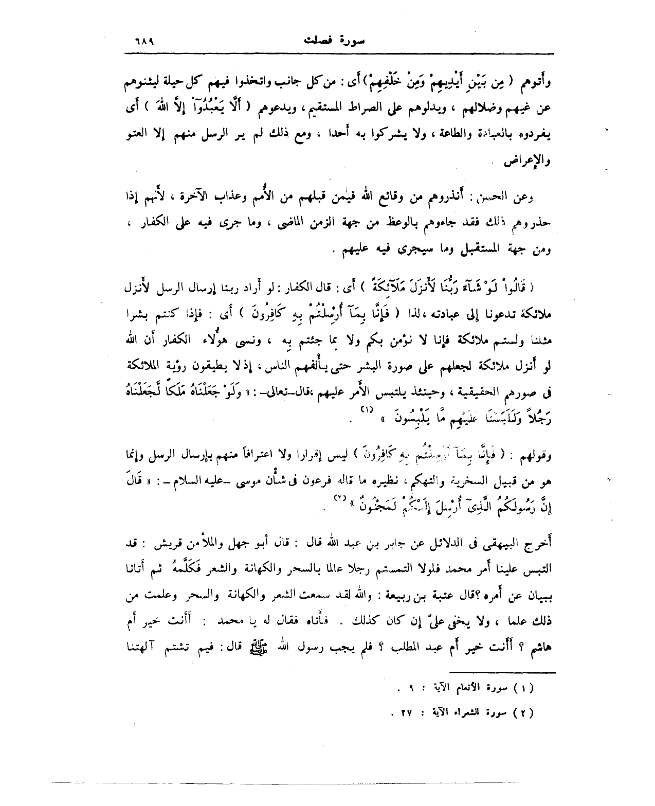 أَخرج البيهقي في الدلائل عن جابر بن عبد الله قال: قال أبو جهل والملأ من قريش: قد التبس علينا أمر محمَّد فلولا التمستم رجلًا عالما بالسحر والكهانة والشعر فَكَلَّمهُ ثم أَتانا ببيان عن أمره؟ قال عتبة بن ربيعة: والله لقد سمعت الشعر والكهانة والسحر وعلمت من ذلك علمًا، ولا يخفى عليّ إن كان كذلك. فأتاه فقال له يا محمد: أَأَنت خير أَم هاشم؟ أَأَنت خير أَم عبد المطلب؟ فلم يجب رسول الله - صلى الله عليه وسلم - قال: فيم تشتم آلهتنا