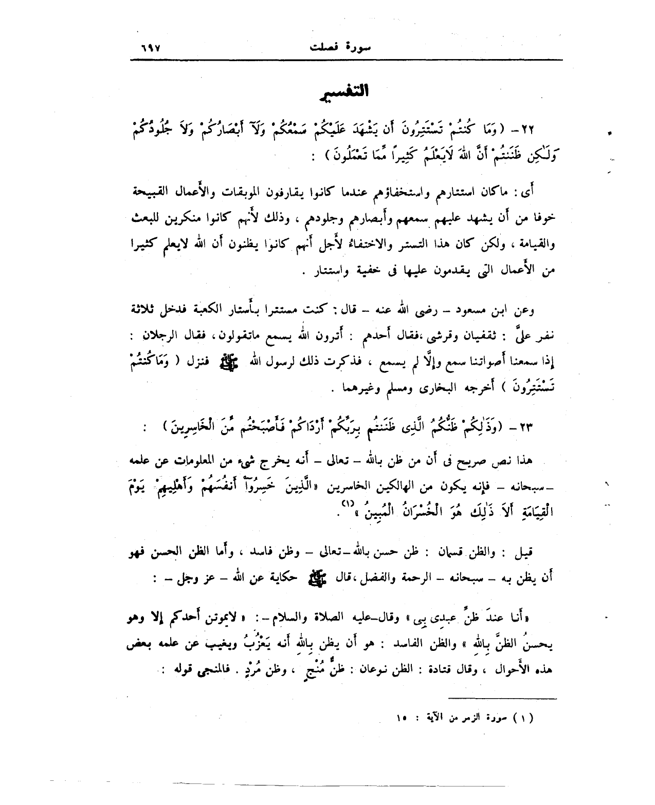 وعن ابن مسعود - رضى الله عنه - قال: كنت مستترا بأَستار الكعبة فدخل ثلاثة نفر عليَّ: ثقفيان وقرشى، فقال أَحدهم: أَترون الله يسمع ما تقولون، فقال الرجلان: إِذا سمعنا أَصواتنا سمع وإِلَّا لم يسمع، فذكرت ذلك لرسول الله - صلى الله عليه وسلم - فنزل {وَمَا كُنْتُمْ تَسْتَتِرُونَ} أَخرجه البخاري ومسلم وغيرهما.