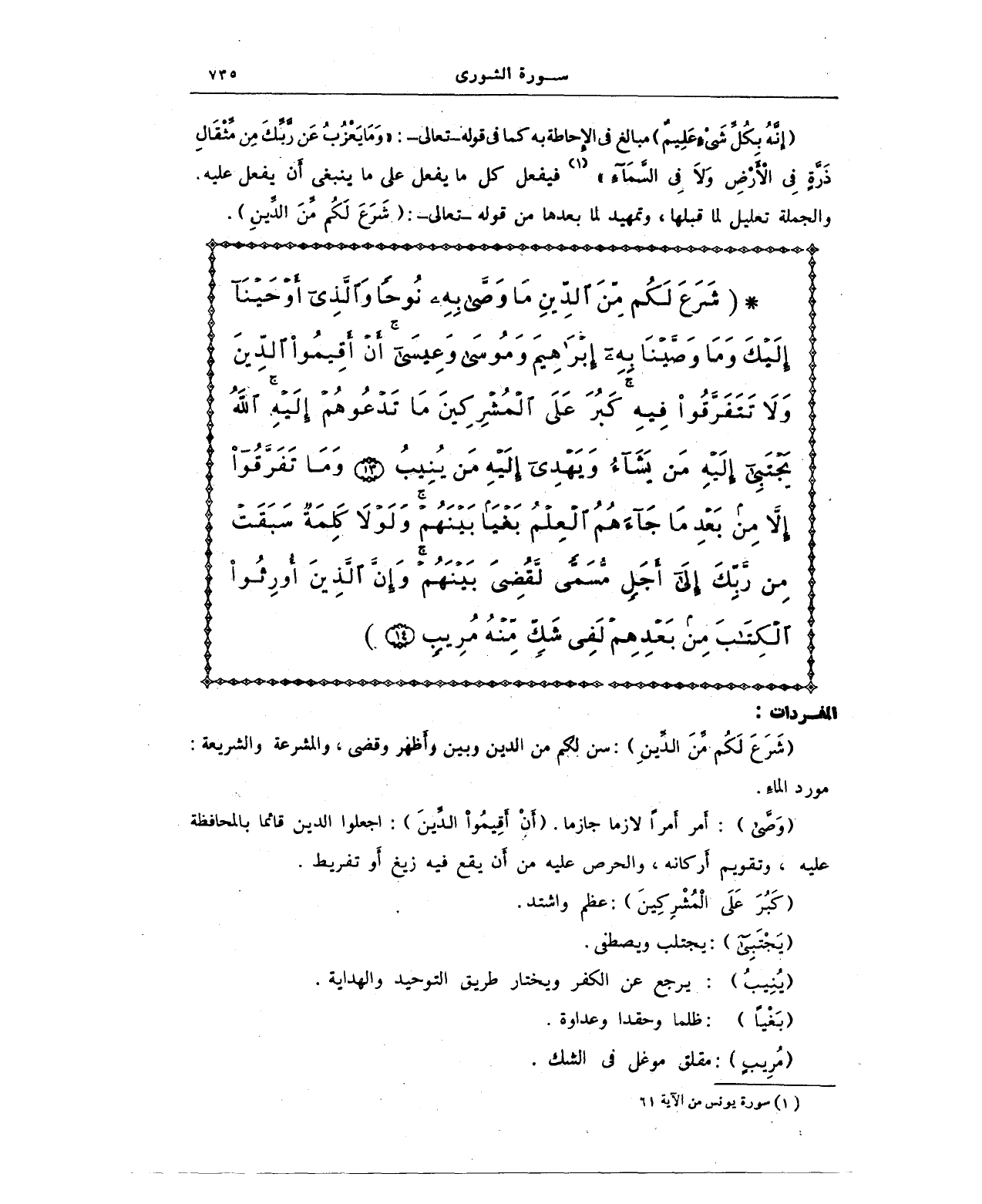 * {شَرَعَ لَكُمْ مِنَ الدِّينِ مَا وَصَّى بِهِ نُوحًا وَالَّذِي أَوْحَيْنَا إِلَيْكَ وَمَا وَصَّيْنَا بِهِ إِبْرَاهِيمَ وَمُوسَى وَعِيسَى أَنْ أَقِيمُوا الدِّينَ وَلَا تَتَفَرَّقُوا فِيهِ كَبُرَ عَلَى الْمُشْرِكِينَ مَا تَدْعُوهُمْ إِلَيْهِ اللَّهُ يَجْتَبِي إِلَيْهِ مَنْ يَشَاءُ وَيَهْدِي إِلَيْهِ مَنْ يُنِيبُ (13) وَمَا تَفَرَّقُوا إِلَّا مِنْ بَعْدِ مَا جَاءَهُمُ الْعِلْمُ بَغْيًا بَيْنَهُمْ وَلَوْلَا كَلِمَةٌ سَبَقَتْ مِنْ رَبِّكَ إِلَى أَجَلٍ مُسَمًّى لَقُضِيَ بَيْنَهُمْ وَإِنَّ الَّذِينَ أُورِثُوا الْكِتَابَ مِنْ بَعْدِهِمْ لَفِي شَكٍّ مِنْهُ مُرِيبٍ (14)}