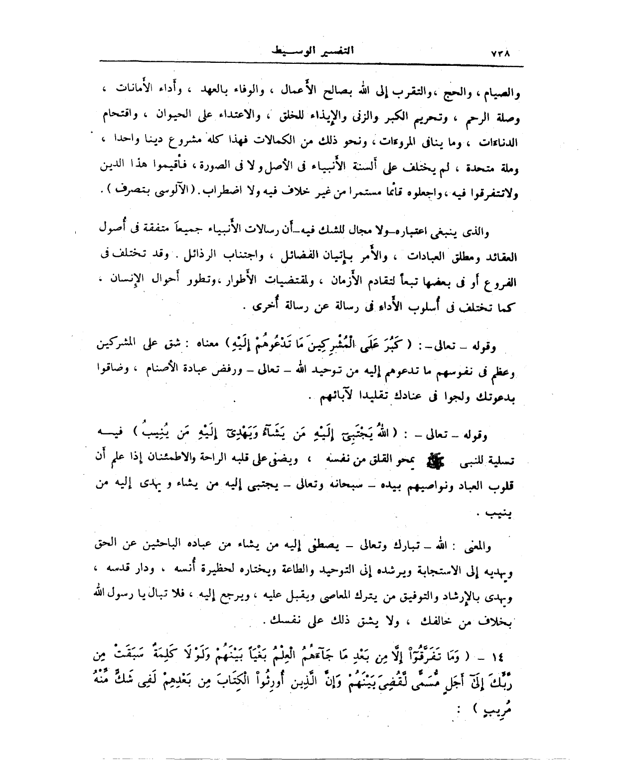 والصيام، والحج، والتقرب إلى الله بصالح الأعمال، والوفاء بالعهد، وأَداء الأَمانات، وصلة الرحم، وتحريم الكبر والزنى والإيذاء للخلق، والاعتداء على الحيوان، واقتحام الدناءَات، وما ينافى المروءَات، ونحو ذلك من الكمالات فهذا كله مشروع دينا واحد، وملة متحدة، لم يختلف علي ألسنة الأنبياء في الأصل ولا في الصورة، فأقيموا هذا الدين ولا تتفرقوا فيه، واجعلوه قائما مستمرا من غير خلاف فيه، لا اضطراب. (الآلوسي بتصرف).
