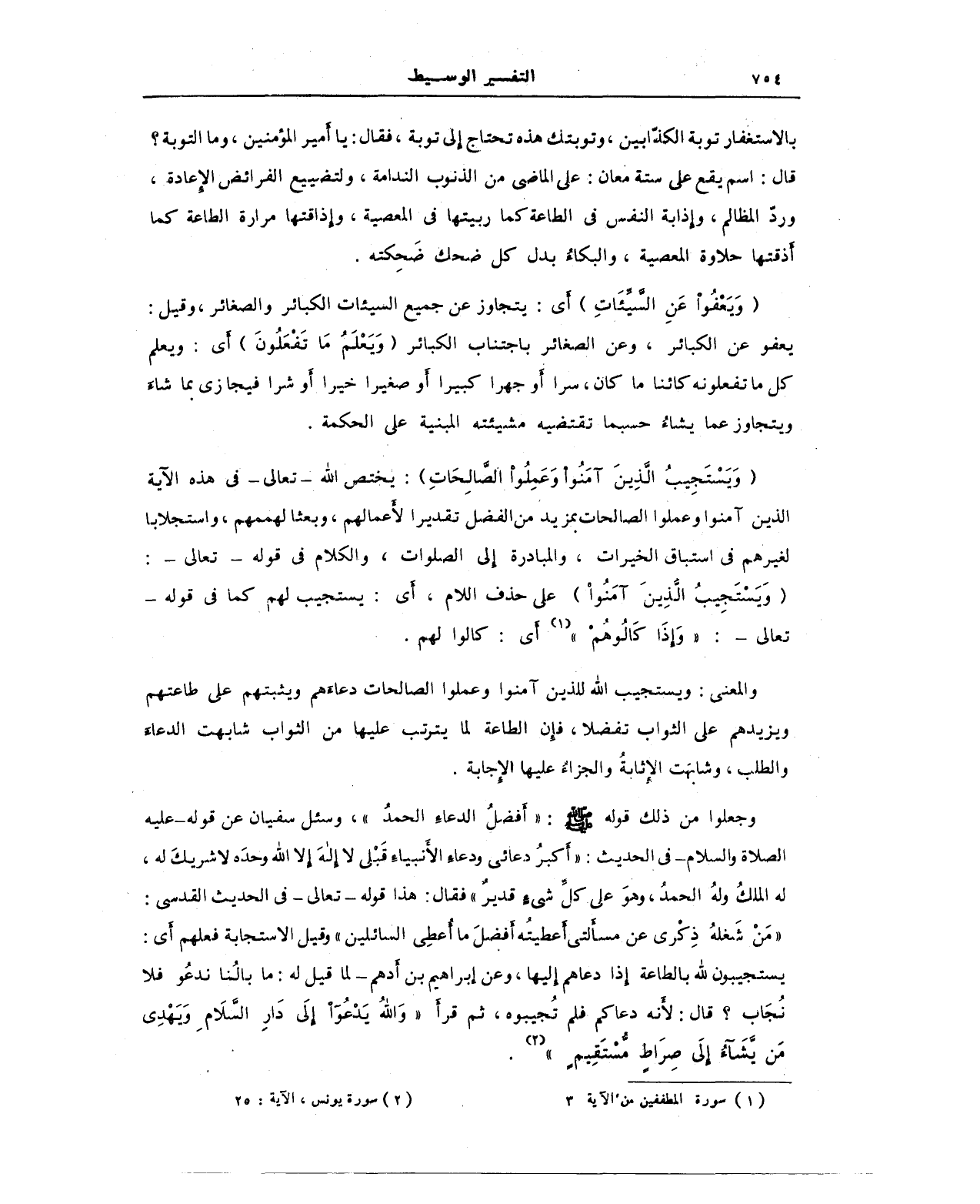 (وَيَسْتَجِيبُ الَّذِينَ آمَنُوا وَعَمِلُوا الصَّالِحَاتِ): يختص الله - تعالى - في هذه الآية الذين آمنوا وعملوا الصالحات بمزيد من الفضل تقديرا لأعمالهم، وبعثا لهممهم، واستجلابا لغيرهم في استباق الخيرات، والمبادرة إلى الصلوات، والكلام في قوله - تعالى -: (وَيَسْتَجِيبُ الَّذِينَ آمَنُوا) على حذف اللام، أَي: يستجيب لهم كما في قوله - تعالى -: {وَإِذَا كَالُوهُمْ} (¬1) أي: كالوا لهم.