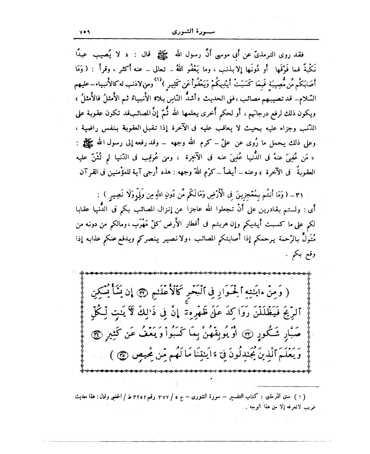 (¬1) سنن الترمذي: كتاب التفسير - سورة الشورى - ج 5/ 377 رقم 3252 ط/الحلبى وقال: هذا حديث غريب لا نعرفه إلا من هذا الوجه.