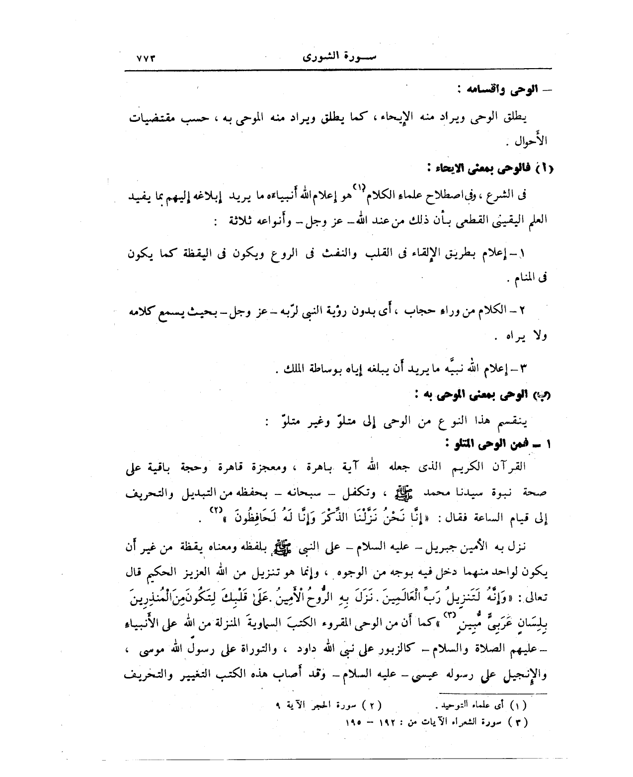 في الشرع، وفي اصطلاح علماء الكلام (¬1) هو إعلام الله أنبياءَه ما يريد إبلاغه إليهم بما يفيد العم اليقينى القطعى بأن ذلك من عند الله - عَزَّ وَجَلَّ - وأنواعه ثلاثة: