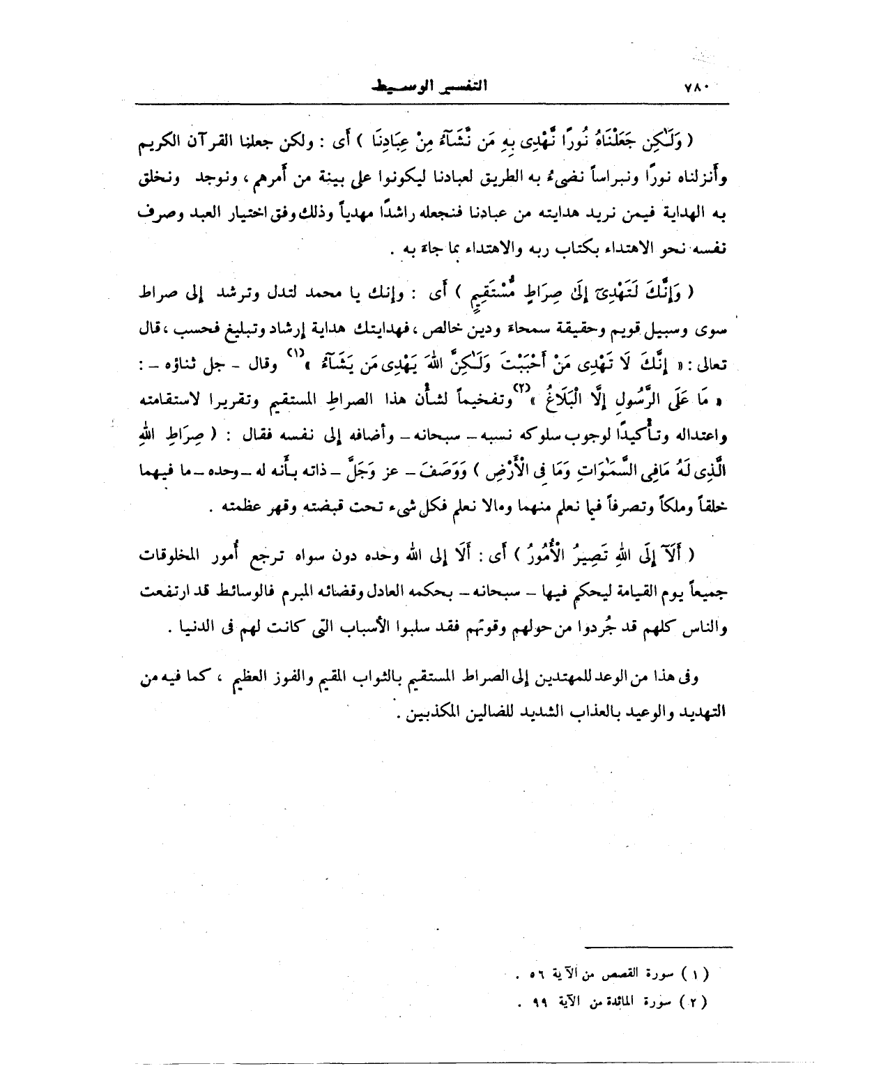 {وَلَكِنْ جَعَلْنَاهُ نُورًا نَهْدِي بِهِ مَنْ نَشَاءُ مِنْ عِبَادِنَا} أي: ولكن جعلنا القرآن الكريم وأنزلناه نورًا ونبراسًا نضىءُ به الطريق لعبادنا ليكونوا على بينة من أمرهم، ونوجد ونخلق به الهداية فيمن نريد هدايته من عبادنا فنجعله راشدًا مهديًا وذلك وفق اختيار العبد وصرف نفسه نحو الاهتداء بكتاب ربه والاهتداء بما جاء به.