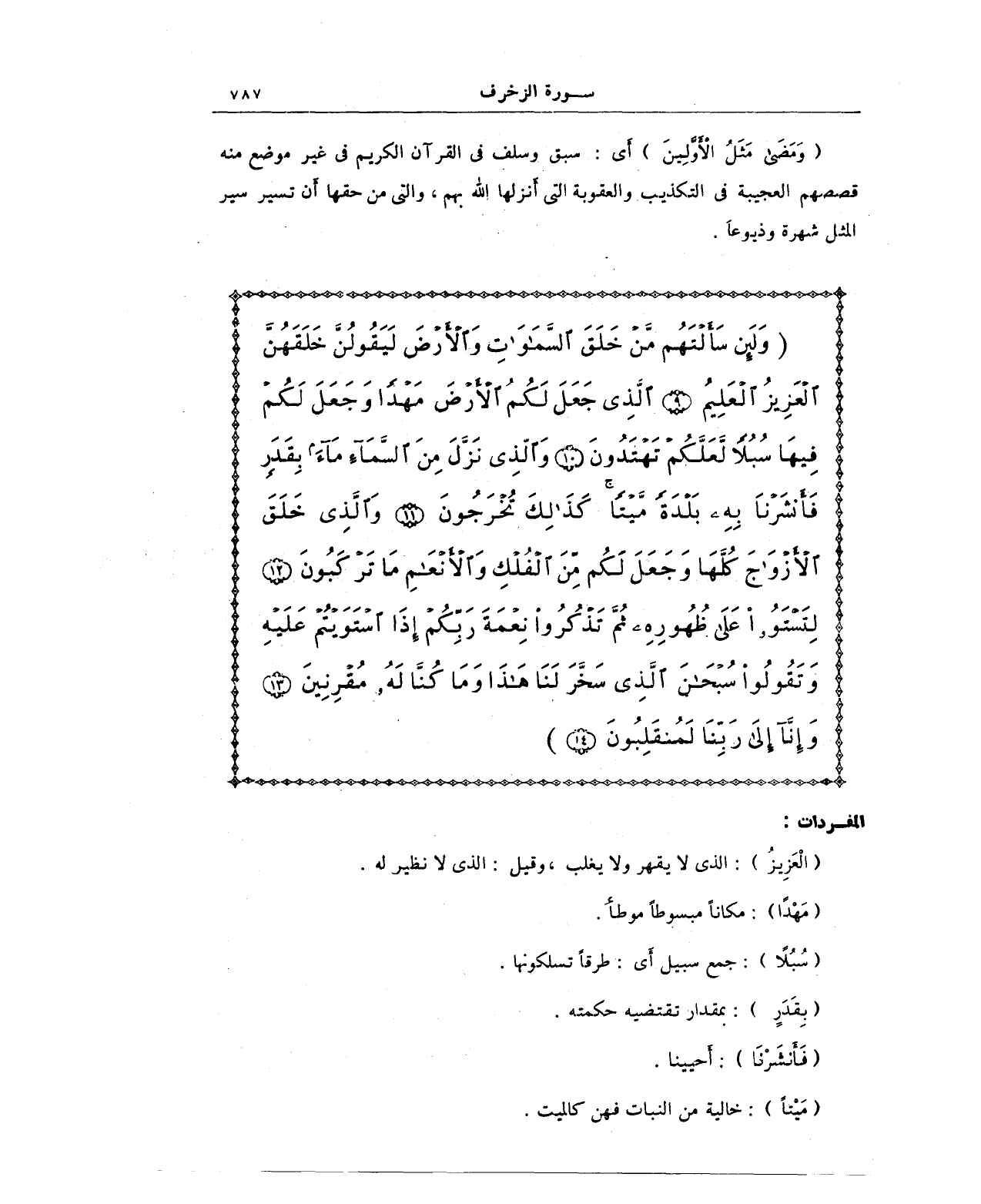 {وَلَئِنْ سَأَلْتَهُمْ مَنْ خَلَقَ السَّمَاوَاتِ وَالْأَرْضَ لَيَقُولُنَّ خَلَقَهُنَّ الْعَزِيزُ الْعَلِيمُ (9) الَّذِي جَعَلَ لَكُمُ الْأَرْضَ مَهْدًا وَجَعَلَ لَكُمْ فِيهَا سُبُلًا لَعَلَّكُمْ تَهْتَدُونَ (10) وَالَّذِي نَزَّلَ مِنَ السَّمَاءِ مَاءً بِقَدَرٍ فَأَنْشَرْنَا بِهِ بَلْدَةً مَيْتًا كَذَلِكَ تُخْرَجُونَ (11) وَالَّذِي خَلَقَ الْأَزْوَاجَ كُلَّهَا وَجَعَلَ لَكُمْ مِنَ الْفُلْكِ وَالْأَنْعَامِ مَا تَرْكَبُونَ (12) لِتَسْتَوُوا عَلَى ظُهُورِهِ ثُمَّ تَذْكُرُوا نِعْمَةَ رَبِّكُمْ إِذَا اسْتَوَيْتُمْ عَلَيْهِ وَتَقُولُوا سُبْحَانَ الَّذِي سَخَّرَ لَنَا هَذَا وَمَا كُنَّا لَهُ مُقْرِنِينَ (13) وَإِنَّا إِلَى رَبِّنَا لَمُنْقَلِبُونَ}