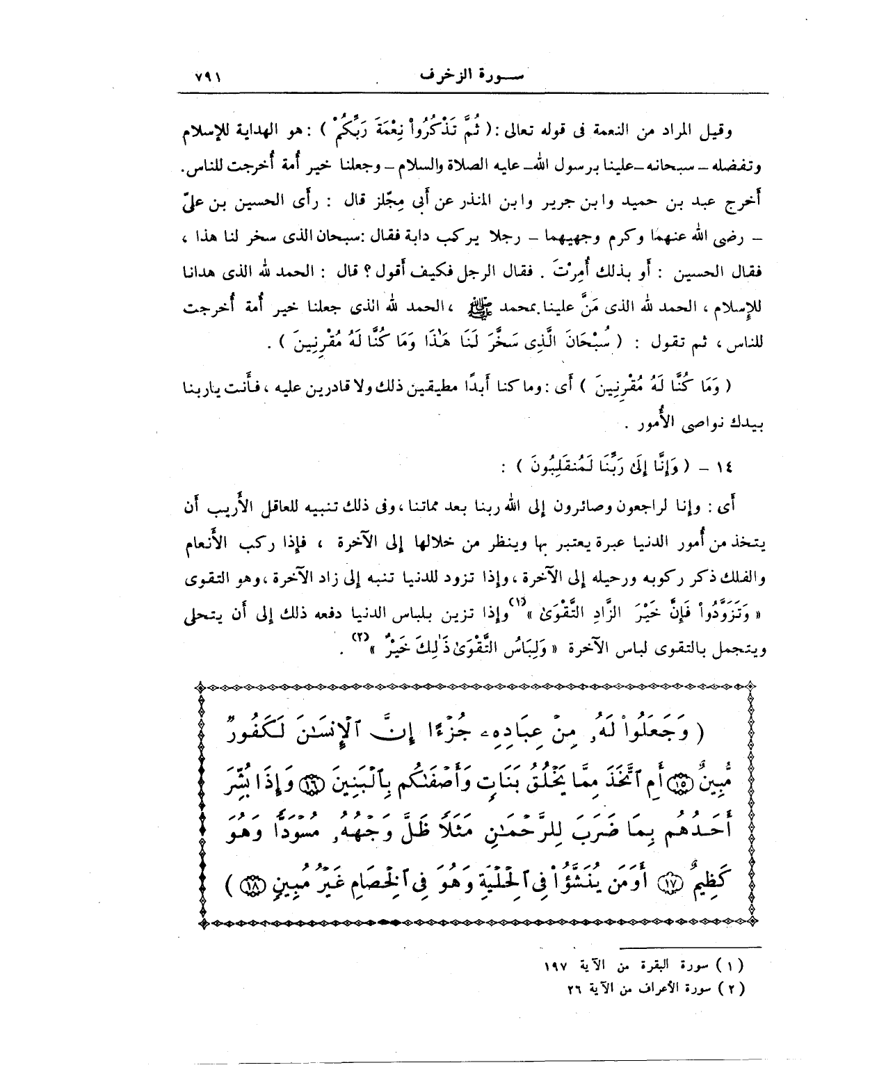 وقيل المراد من النعمة في قوله تعالى: {ثُمَّ تَذْكُرُوا نِعْمَةَ رَبِّكُمْ}: هو الهداية للإسلام وتفضله - سبحانه - علينا برسول الله - صلى الله عليه وسلم - وجعلنا خير أمة أخرجت للناس. أخرج عبد بن حميد وابن جرير وابن المنذر عن أبي مِجّلز قال: رأى الحسين بن عليّ - رضي الله عنهما وكرم وجهيهما - رجلًا يركب دابة فقال: سبحان الذي سخر لنا هذا، فقال الحسين: أو بذلك أُمِرْتَ. فقال الرجل فكيف أقول؟ قال: الحمد لله الذي هدانا للإسلام، الحمد لله الذي مَنَّ علينا بمحمد - صلى الله عليه وسلم -، الحمد لله الذي جعلنا خير أمة أخرجت للناس، ثم تقول: {سُبْحَانَ الَّذِي سَخَّرَ لَنَا هَذَا وَمَا كُنَّا لَهُ مُقْرِنِينَ}.