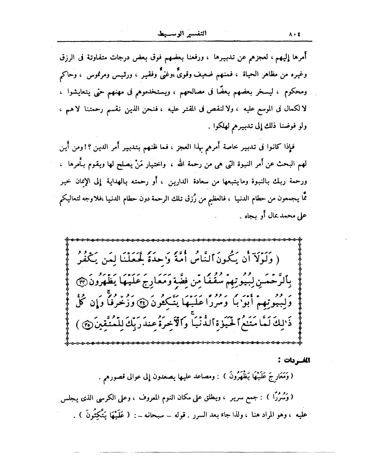 {وَسُرُرًا}: جمع سرير، ويطلق على مكان النوم المعروف، وعلى الكرسى الذي يجلس عليه، وهو المراد هنا، ولذا جاءَ بعد السرر. قوله - سبحانه -: {عَلَيْهَا يَتَّكِئُونَ}.