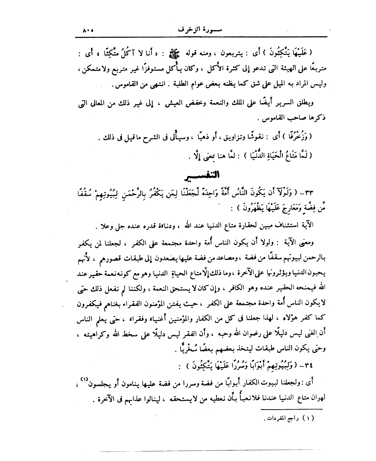 ومعنى الآية: ولولا أن يكون الناس أُمة واحدة مجتمعة على الكفر، لجعلنا لمن يكفر بالرحمن لبيوتهم سقفًا من فضة، ومصاعد عن فضة عليها يصعدون إلى طبقات قصورهم؛ لأنهم يحبون الدنيا ويؤثرونها على الآخرة، وما ذلك إلَّا متاع الحياة الدنيا وهو مع كونه نعمة حقير عند الله فيمنحه الحقير عنده وهو الكافر، وإن كان لا يستحق النعمة، ولكننا لم نفعل ذلك حتى لا يكون الناس أمة واحدة مجتمعة على الكفر، حيث يفتن المؤمنون الفقراء بغناهم فيكفرون كما كفر هؤلاء، لهذا جعلنا في كل من الكفار والمؤمنين أغنياء وفقراء، حتى يعلم الناس أن الغنى ليس دليلًا على رضوان الله وحبه، وإن الفقر ليس دليلًا على سخط الله وكراهيته، وحتى يكون الناس طبقات ليتخذ بعضهم بعضًا سُخْريًّا.