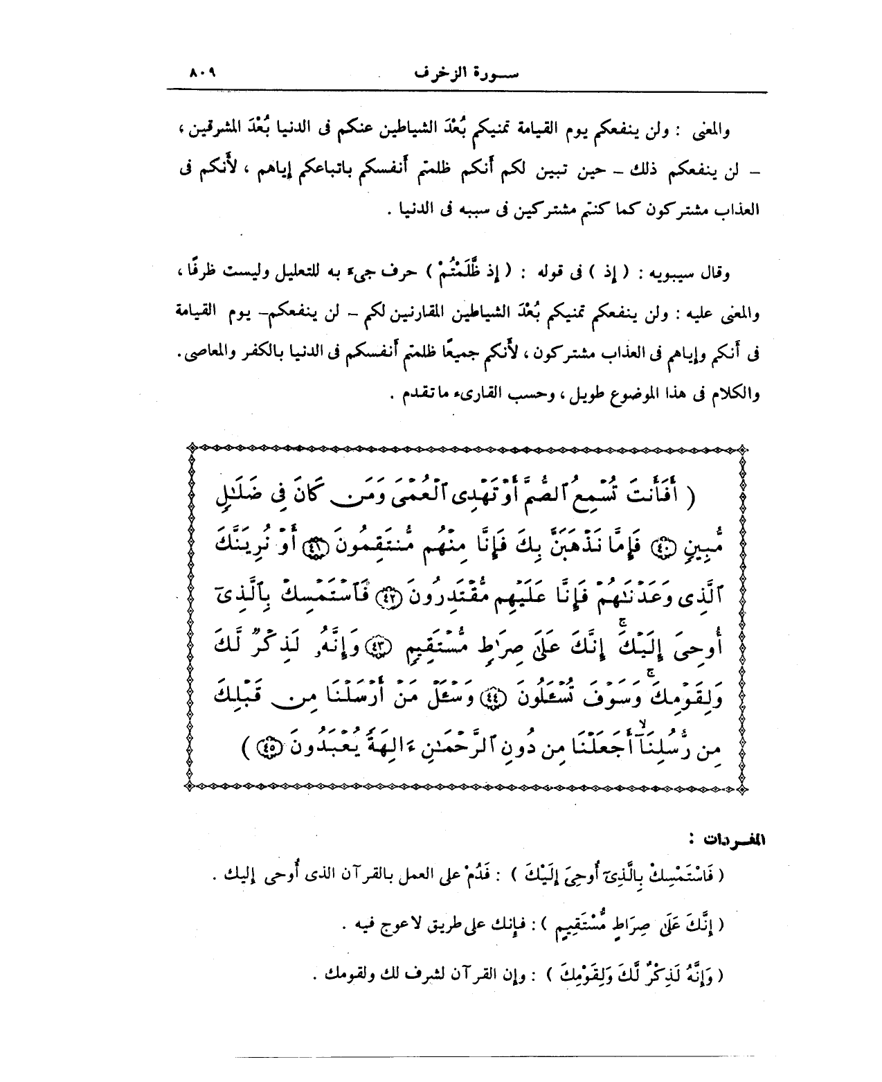 وقال سيبويه: (إذ) في قوله: {إِذْ ظَلَمْتُمْ} حرف جىء به للتعليل وليست ظرفًا، والمعنى عليه: ولن ينفعكم تمنيكم بُعْدَ الشياطين المقارنين لكم - لن ينفعكم - يوم القيامة في أنكم وإياهم في العذاب مشتركون، لأنكم جميعًا ظلمتم أنفسكم في الدنيا بالكفر والمعاصي. والكلام في هذا الموضوع طويل، وحسب القارئ ما تقدم.