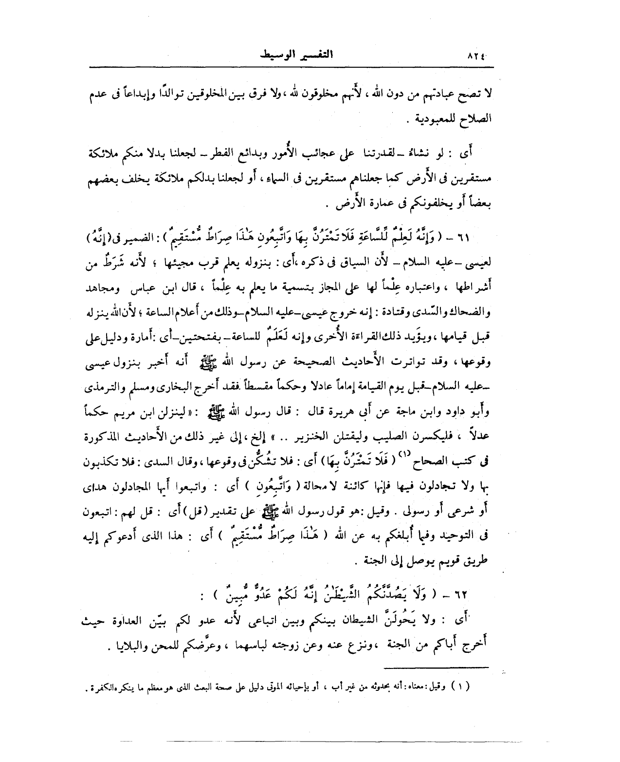 61 - {وَإِنَّهُ لَعِلْمٌ لِلسَّاعَةِ فَلَا تَمْتَرُنَّ بِهَا وَاتَّبِعُونِ هَذَا صِرَاطٌ مُسْتَقِيمٌ}: الضمير في {إِنَّهُ} لعيسى - عليه السلام - لأن السياق في ذكره، أي: بنزوله يعلم قرب مجيئها؛ لأنه شَرَطٌ من أشراطها، واعتباره عِلْمًا لها على المجاز بتسمية ما يعلم به علمًا، قال ابن عباس ومجاهد والضحاك والسدى وقتادة: إنه خروج عيسى - عليه السلام - وذلك من أعلام الساعة؛ لأن الله ينزله قبل قيامها، ويؤيد ذلك القراءة الأخرى وإنه لَعَلَمٌ للساعة - بفتحتين - أي: أمارة ودليل على وقوعها، وقد تواترت الأحاديث الصحيحة عن رسول الله - صلى الله عليه وسلم - أنه أخبر بنزول عيسى - عليه السلام - قبل يوم القيامة إمامًا عادلًا وحكمًا مقسطًا فقد أخرج البخاري ومسلم والترمذي وأبو داود وابن ماجة عن أبي هريرة قال: قال رسول الله - صلى الله عليه وسلم -: "لينزلن ابن مريم حكمًا عدلًا، فليكسرن الصليب وليقتلن الخنزير ... " إلخ، إلى غير ذلك من الأحاديث المذكورة في كتب الصححاح (¬1) {فَلَا تَمْتَرُنَّ بِهَا} أي: فلا تشُكُّن في وقوعها، وقال السدى: فلا تكذبون بها ولا تجادلون فيها فإنها كائنة لا محالة {وَاتَّبِعُونِ} أي: واتبعوا أيها المجادلون هداى أو شرعى أو رسولي. وقيل: هو قول رسول الله - صلى الله عليه وسلم - على تقدير (قل) أي: قل لهم: اتبعون في التوحيد وفيما أُبلغكم به عن الله {هَذَا صِرَاطٌ مُسْتَقِيمٌ} أي: هذا الذي أدعوكم إليه طريق قويم يوصل إلى الجنة.