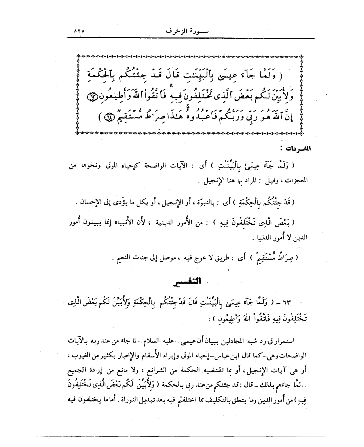 استمرار في رد شبه المجادلين ببيان أن عيسى - عليه السلام - لما جاء من عند ربه بالآيات الواضحات وهي - كما قال ابن عباس - إحياء الموتى وإبراء الأسقام والإخبار بكثير من الغيوب، أو هي آيات الإنجيل، أو بما تقتضيه الحكمة من الشرائع، ولا مانع من إرادة الجميع - لما جاءهم بذلك - قال: قد جئتكم من عند ربي بالحكمة {وَلِأُبَيِّنَ لَكُمْ بَعْضَ الَّذِي تَخْتَلِفُونَ فِيهِ} من أُمور الدين وما يتعلق بالتكليف مما اختلفتم فيه بعد تبديل التوراة. أما ما يختلفون فيه
