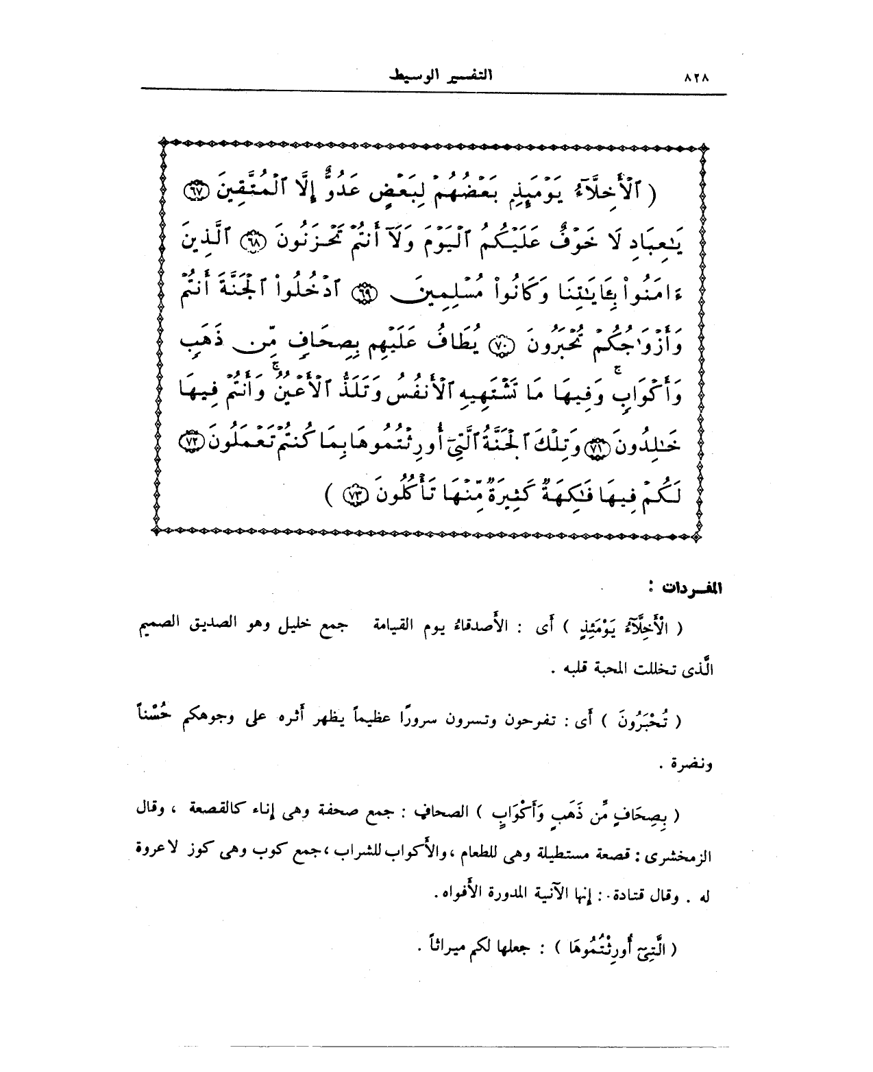 {الْأَخِلَّاءُ يَوْمَئِذٍ بَعْضُهُمْ لِبَعْضٍ عَدُوٌّ إِلَّا الْمُتَّقِينَ (67) يَا عِبَادِ لَا خَوْفٌ عَلَيْكُمُ الْيَوْمَ وَلَا أَنْتُمْ تَحْزَنُونَ (68) الَّذِينَ آمَنُوا بِآيَاتِنَا وَكَانُوا مُسْلِمِينَ (69) ادْخُلُوا الْجَنَّةَ أَنْتُمْ وَأَزْوَاجُكُمْ تُحْبَرُونَ (70) يُطَافُ عَلَيْهِمْ بِصِحَافٍ مِنْ ذَهَبٍ وَأَكْوَابٍ وَفِيهَا مَا تَشْتَهِيهِ الْأَنْفُسُ وَتَلَذُّ الْأَعْيُنُ وَأَنْتُمْ فِيهَا خَالِدُونَ (71) وَتِلْكَ الْجَنَّةُ الَّتِي أُورِثْتُمُوهَا بِمَا كُنْتُمْ تَعْمَلُونَ (72) لَكُمْ فِيهَا فَاكِهَةٌ كَثِيرَةٌ مِنْهَا تَأْكُلُونَ (73)} المفردات:
