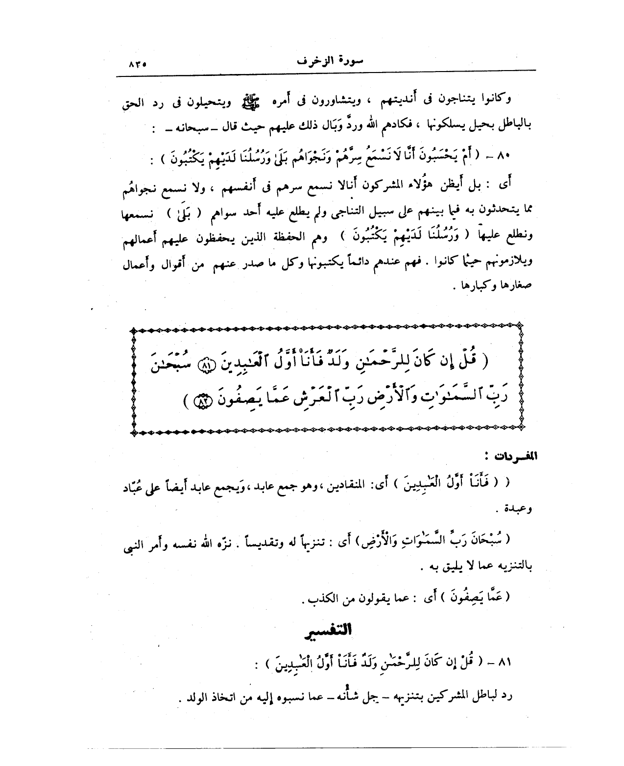 {قُلْ إِنْ كَانَ لِلرَّحْمَنِ وَلَدٌ فَأَنَا أَوَّلُ الْعَابِدِينَ (81) سُبْحَانَ رَبِّ السَّمَاوَاتِ وَالْأَرْضِ رَبِّ الْعَرْشِ عَمَّا يَصِفُونَ (82)}