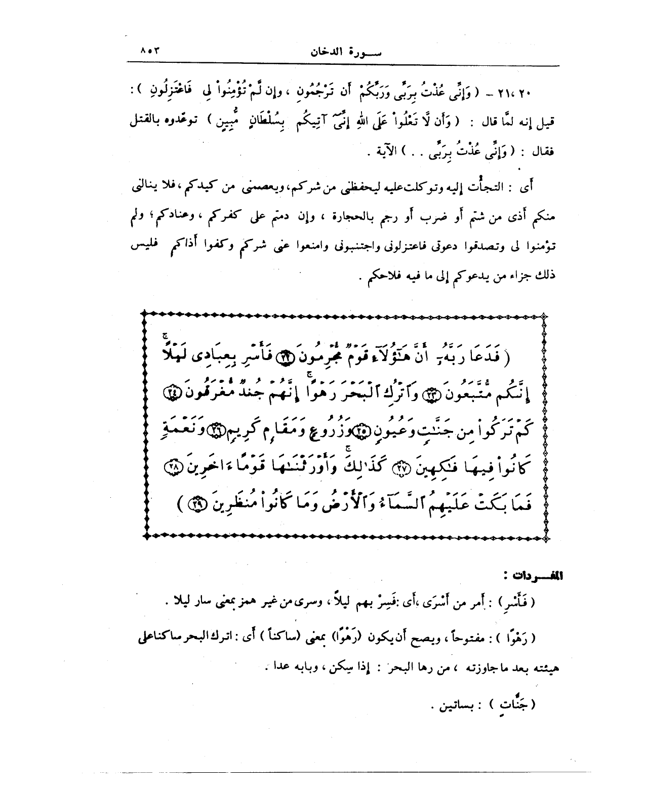 {فَدَعَا رَبَّهُ أَنَّ هَؤُلَاءِ قَوْمٌ مُجْرِمُونَ (22) فَأَسْرِ بِعِبَادِي لَيْلًا إِنَّكُمْ مُتَّبَعُونَ (23) وَاتْرُكِ الْبَحْرَ رَهْوًا إِنَّهُمْ جُنْدٌ مُغْرَقُونَ (24) كَمْ تَرَكُوا مِنْ جَنَّاتٍ وَعُيُونٍ (25) وَزُرُوعٍ وَمَقَامٍ كَرِيمٍ (26) وَنَعْمَةٍ كَانُوا فِيهَا فَاكِهِينَ (27) كَذَلِكَ وَأَوْرَثْنَاهَا قَوْمًا آخَرِينَ (28) فَمَا بَكَتْ عَلَيْهِمُ السَّمَاءُ وَالْأَرْضُ وَمَا كَانُوا مُنْظَرِينَ}