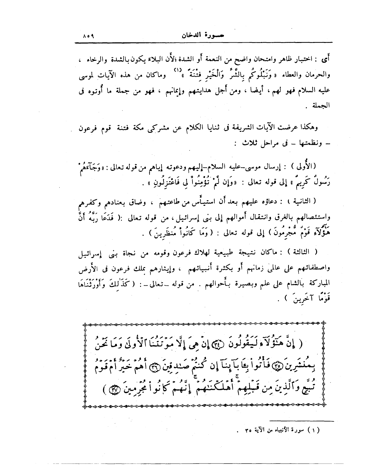وهكذا عرضت الآيات الشريفة في ثنايا الكلام عن مشركى مكة فتنة قوم فرعون - ونظمتها - في مراحل ثلاث: