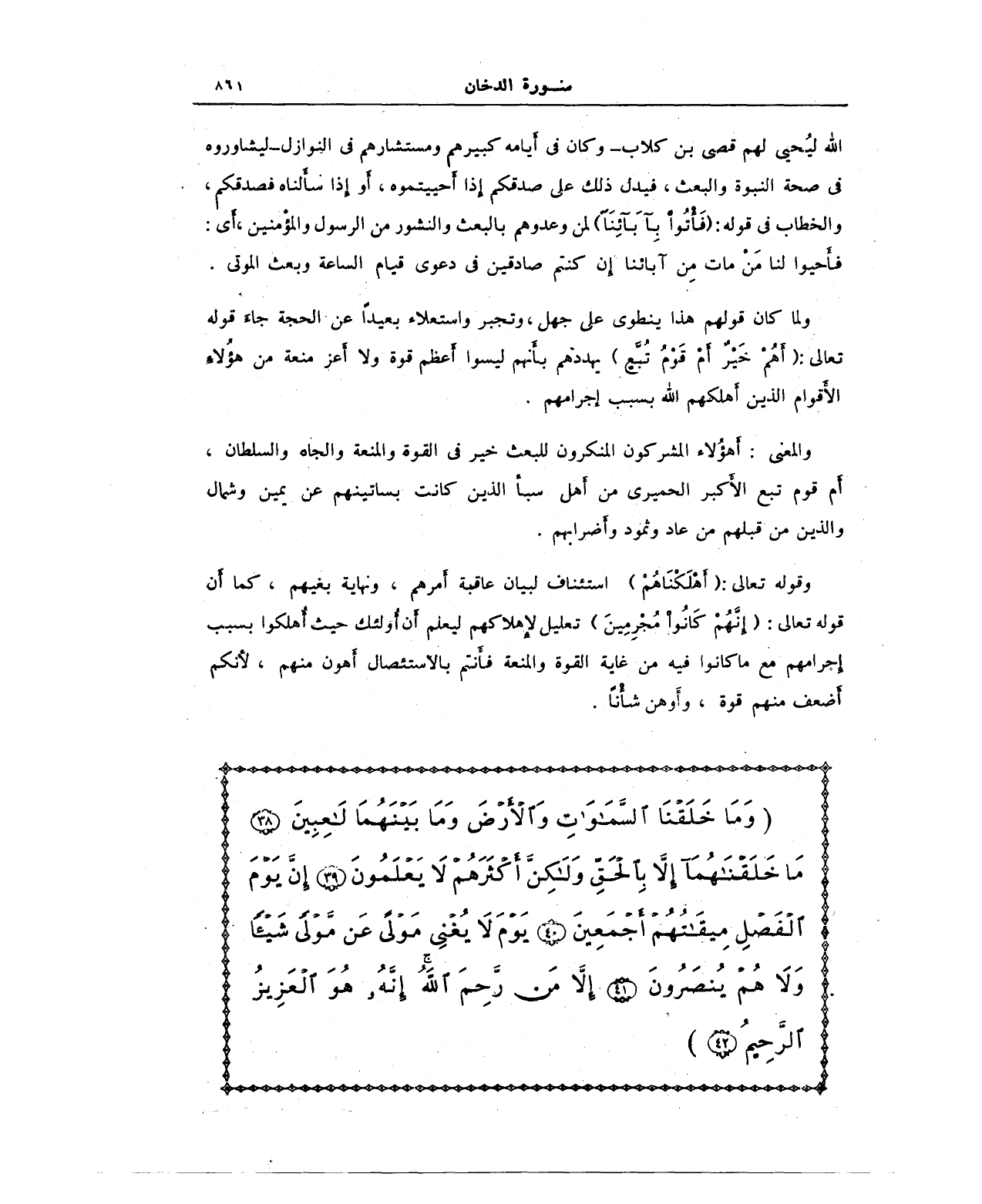 {وَمَا خَلَقْنَا السَّمَاوَاتِ وَالْأَرْضَ وَمَا بَيْنَهُمَا لَاعِبِينَ (38) مَا خَلَقْنَاهُمَا إِلَّا بِالْحَقِّ وَلَكِنَّ أَكْثَرَهُمْ لَا يَعْلَمُونَ (39) إِنَّ يَوْمَ الْفَصْلِ مِيقَاتُهُمْ أَجْمَعِينَ (40) يَوْمَ لَا يُغْنِي مَوْلًى عَنْ مَوْلًى شَيْئًا وَلَا هُمْ يُنْصَرُونَ (41) إِلَّا مَنْ رَحِمَ اللَّهُ إِنَّهُ هُوَ الْعَزِيزُ الرَّحِيمُ}