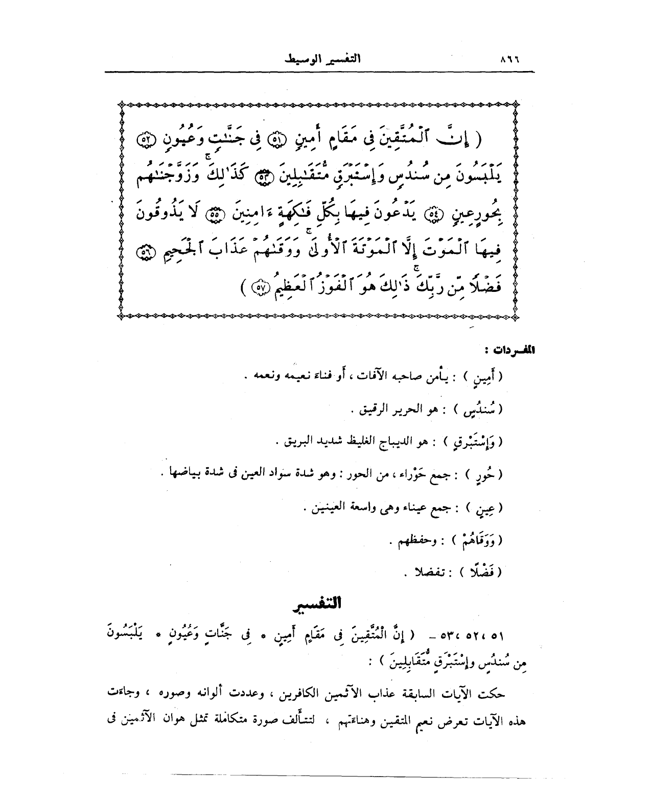 {إِنَّ الْمُتَّقِينَ فِي مَقَامٍ أَمِينٍ (51) فِي جَنَّاتٍ وَعُيُونٍ (52) يَلْبَسُونَ مِنْ سُنْدُسٍ وَإِسْتَبْرَقٍ مُتَقَابِلِينَ (53) كَذَلِكَ وَزَوَّجْنَاهُمْ بِحُورٍ عِينٍ (54) يَدْعُونَ فِيهَا بِكُلِّ فَاكِهَةٍ آمِنِينَ (55) لَا يَذُوقُونَ فِيهَا الْمَوْتَ إِلَّا الْمَوْتَةَ الْأُولَى وَوَقَاهُمْ عَذَابَ الْجَحِيمِ (56) فَضْلًا مِنْ رَبِّكَ ذَلِكَ هُوَ الْفَوْزُ الْعَظِيمُ}