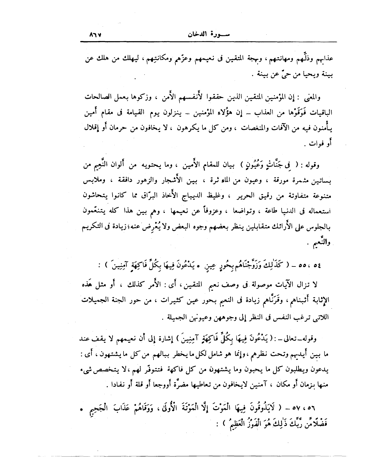 لا تزال الآيات موصولة في وصف نعيم التقين، أَي: الأَمر كذلك، أَو مثل هذه الإِثابة أَثبناهم، وقَرَنَّاهم زيادة في النعيم بحور عين كثيرات، من حور الجنة الجميلات اللاتى ترغب النفس في النظر إلى وجوههن وعيونهن الجميلة.