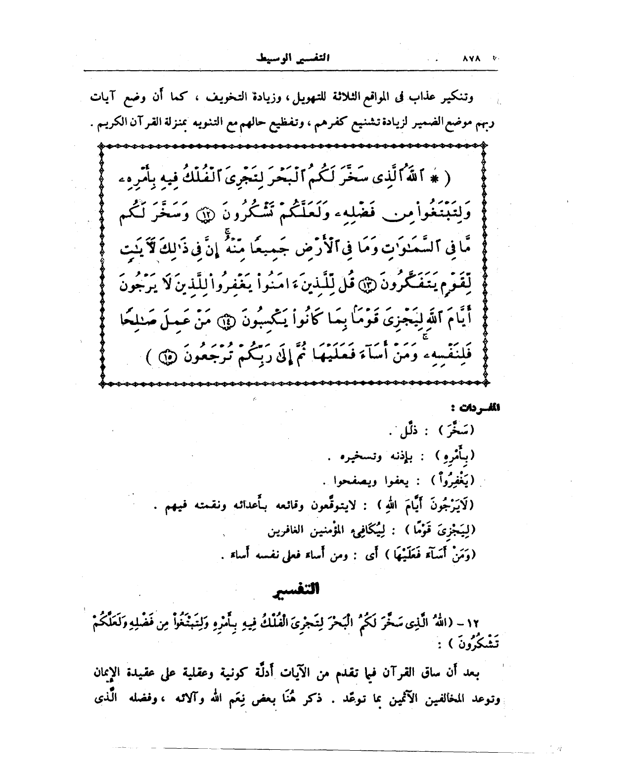 * {اللَّهُ الَّذِي سَخَّرَ لَكُمُ الْبَحْرَ لِتَجْرِيَ الْفُلْكُ فِيهِ بِأَمْرِهِ وَلِتَبْتَغُوا مِنْ فَضْلِهِ وَلَعَلَّكُمْ تَشْكُرُونَ (12) وَسَخَّرَ لَكُمْ مَا فِي السَّمَاوَاتِ وَمَا فِي الْأَرْضِ جَمِيعًا مِنْهُ إِنَّ فِي ذَلِكَ لَآيَاتٍ لِقَوْمٍ يَتَفَكَّرُونَ (13) قُلْ لِلَّذِينَ آمَنُوا يَغْفِرُوا لِلَّذِينَ لَا يَرْجُونَ أَيَّامَ اللَّهِ لِيَجْزِيَ قَوْمًا بِمَا كَانُوا يَكْسِبُونَ (14) مَنْ عَمِلَ صَالِحًا فَلِنَفْسِهِ وَمَنْ أَسَاءَ فَعَلَيْهَا ثُمَّ إِلَى رَبِّكُمْ تُرْجَعُونَ (15)}