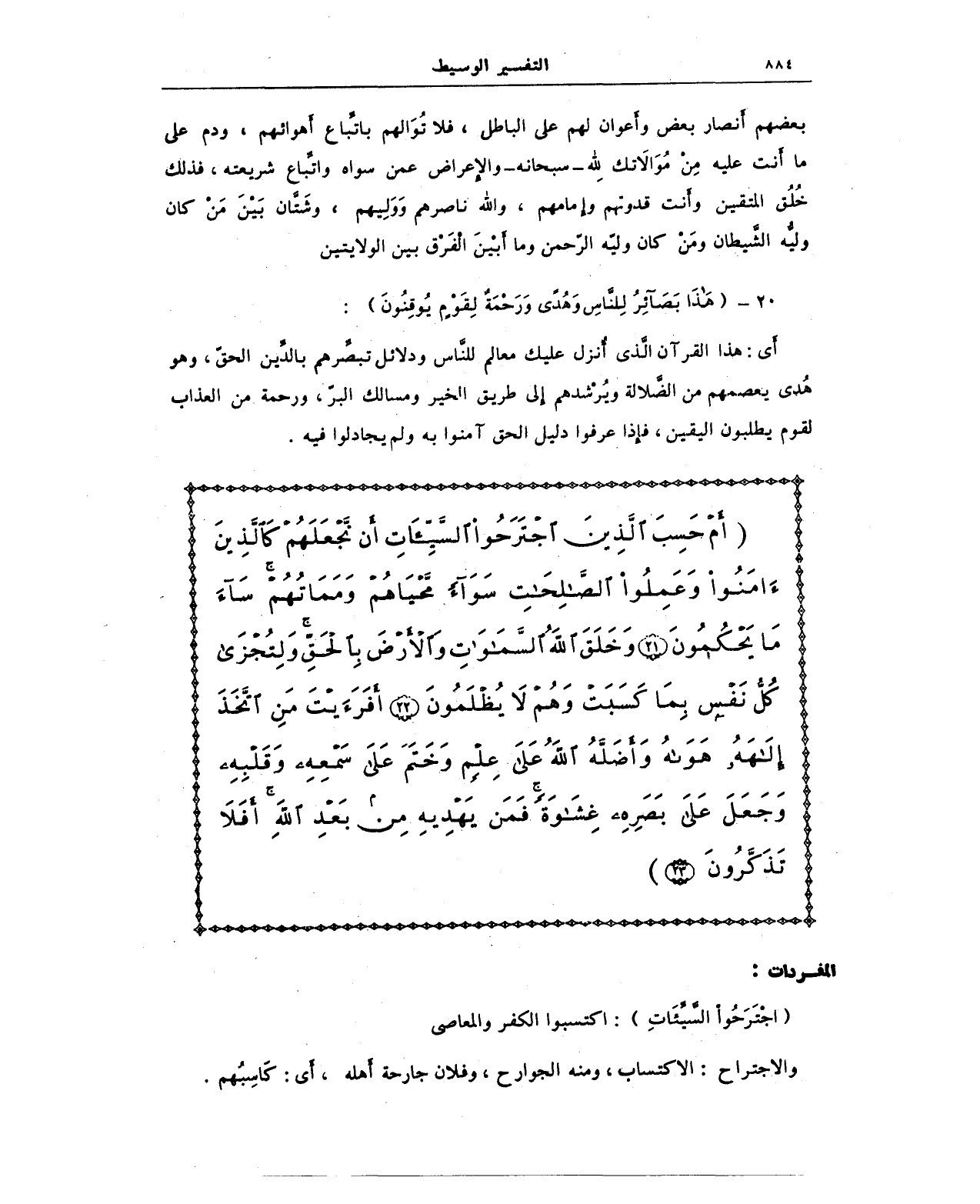 {أَمْ حَسِبَ الَّذِينَ اجْتَرَحُوا السَّيِّئَاتِ أَنْ نَجْعَلَهُمْ كَالَّذِينَ آمَنُوا وَعَمِلُوا الصَّالِحَاتِ سَوَاءً مَحْيَاهُمْ وَمَمَاتُهُمْ سَاءَ مَا يَحْكُمُونَ (21) وَخَلَقَ اللَّهُ السَّمَاوَاتِ وَالْأَرْضَ بِالْحَقِّ وَلِتُجْزَى كُلُّ نَفْسٍ بِمَا كَسَبَتْ وَهُمْ لَا يُظْلَمُونَ (22) أَفَرَأَيْتَ مَنِ اتَّخَذَ إِلَهَهُ هَوَاهُ وَأَضَلَّهُ اللَّهُ عَلَى عِلْمٍ وَخَتَمَ عَلَى سَمْعِهِ وَقَلْبِهِ وَجَعَلَ عَلَى بَصَرِهِ غِشَاوَةً فَمَنْ يَهْدِيهِ مِنْ بَعْدِ اللَّهِ أَفَلَا تَذَكَّرُونَ (23)}