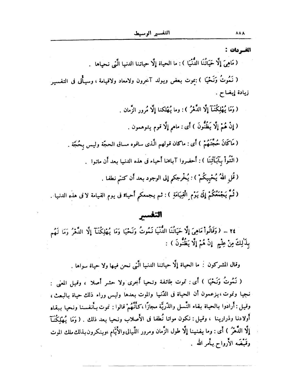 24 - {وَقَالُوا مَا هِيَ إِلَّا حَيَاتُنَا الدُّنْيَا نَمُوتُ وَنَحْيَا وَمَا يُهْلِكُنَا إِلَّا الدَّهْرُ وَمَا لَهُمْ بِذَلِكَ مِنْ عِلْمٍ إِنْ هُمْ إِلَّا يَظُنُّونَ}: