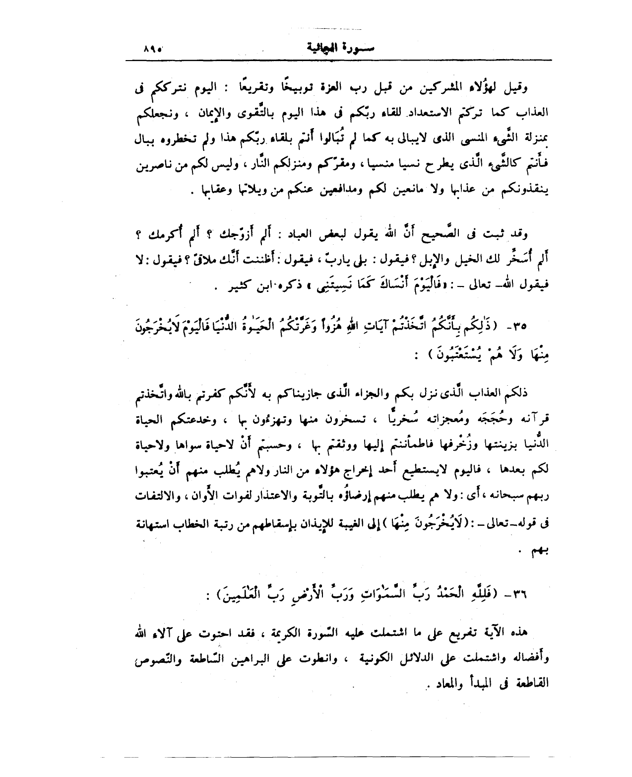 35 - {ذَلِكُمْ بِأَنَّكُمُ اتَّخَذْتُمْ آيَاتِ اللَّهِ هُزُوًا وَغَرَّتْكُمُ الْحَيَاةُ الدُّنْيَا فَالْيَوْمَ لَا يُخْرَجُونَ مِنْهَا وَلَا هُمْ يُسْتَعْتَبُونَ}: