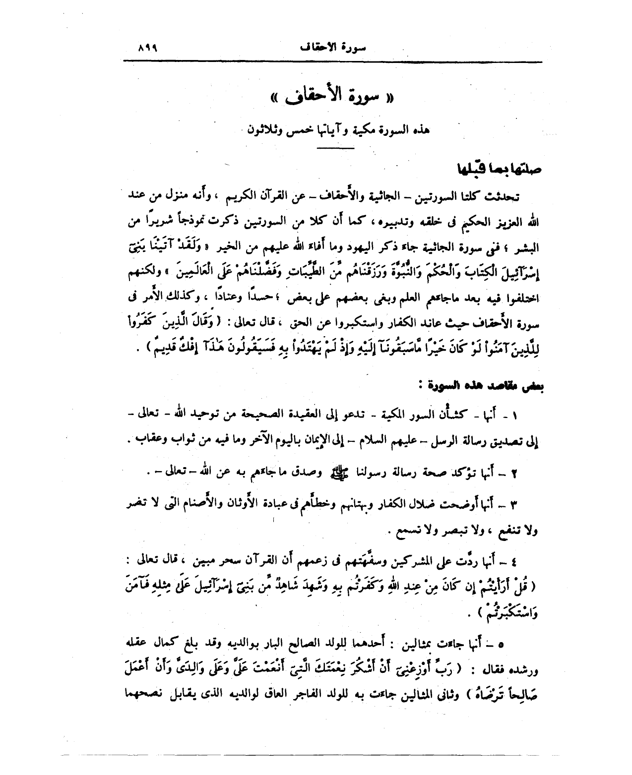 5 - أنها جاءت بمثالين: أحدهما للولد الصالح البار بوالديه وقد بلغ كمال عقله ورشده فقاله: {رَبِّ أَوْزِعْنِي أَنْ أَشْكُرَ نِعْمَتَكَ الَّتِي أَنْعَمْتَ عَلَيَّ وَعَلَى وَالِدَيَّ وَأَنْ أَعْمَلَ صَالِحًا تَرْضَاهُ} وثاني المثالين جاءت به للولد الفاجر العاق لوالديه الذي يقابل نصحهما