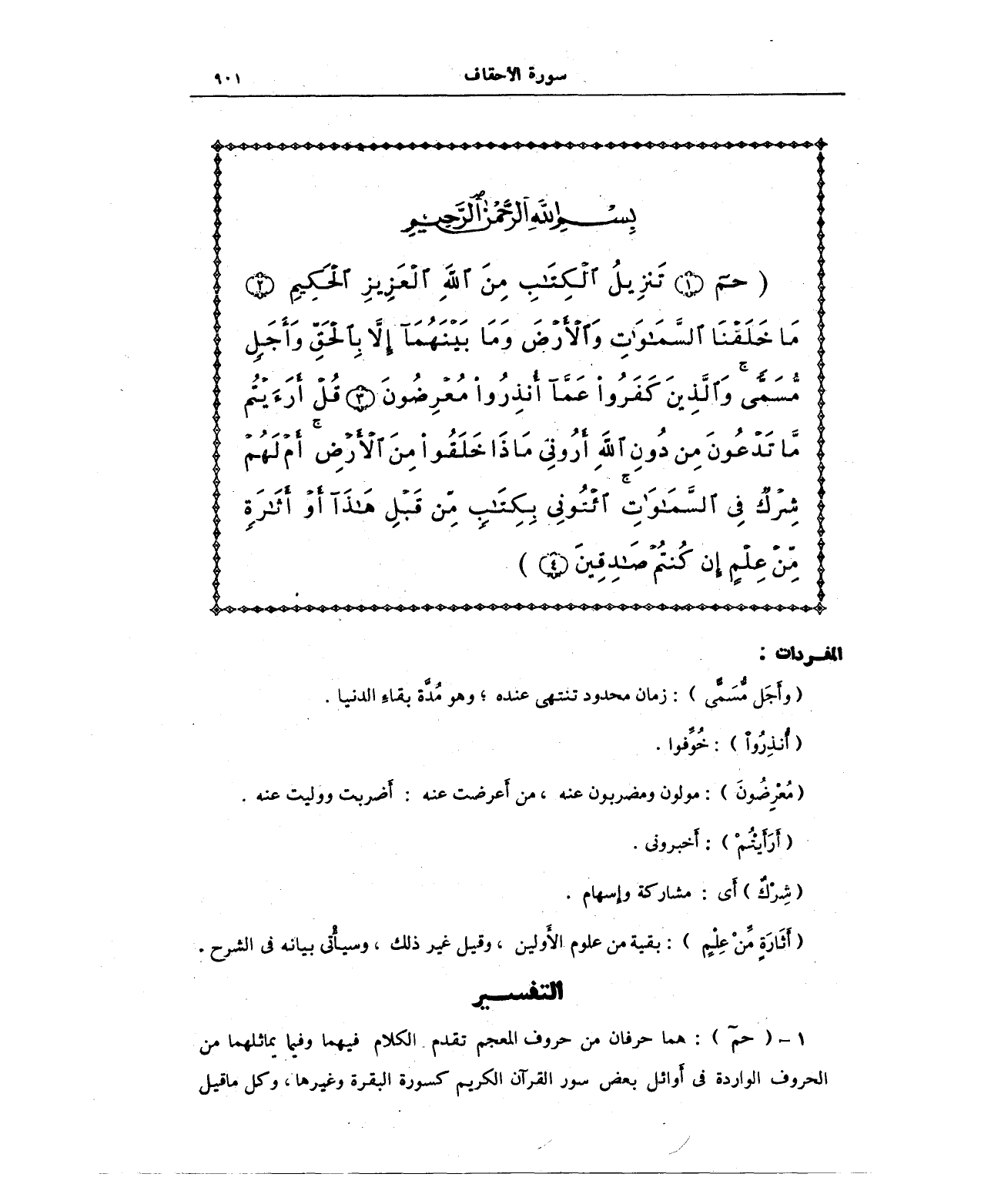 {حم (1) تَنْزِيلُ الْكِتَابِ مِنَ اللَّهِ الْعَزِيزِ الْحَكِيمِ (2) مَا خَلَقْنَا السَّمَاوَاتِ وَالْأَرْضَ وَمَا بَيْنَهُمَا إِلَّا بِالْحَقِّ وَأَجَلٍ مُسَمًّى وَالَّذِينَ كَفَرُوا عَمَّا أُنْذِرُوا مُعْرِضُونَ (3) قُلْ أَرَأَيْتُمْ مَا تَدْعُونَ مِنْ دُونِ اللَّهِ أَرُونِي مَاذَا خَلَقُوا مِنَ الْأَرْضِ أَمْ لَهُمْ شِرْكٌ فِي السَّمَاوَاتِ ائْتُونِي بِكِتَابٍ مِنْ قَبْلِ هَذَا أَوْ أَثَارَةٍ مِنْ عِلْمٍ إِنْ كُنْتُمْ صَادِقِينَ (4)}.