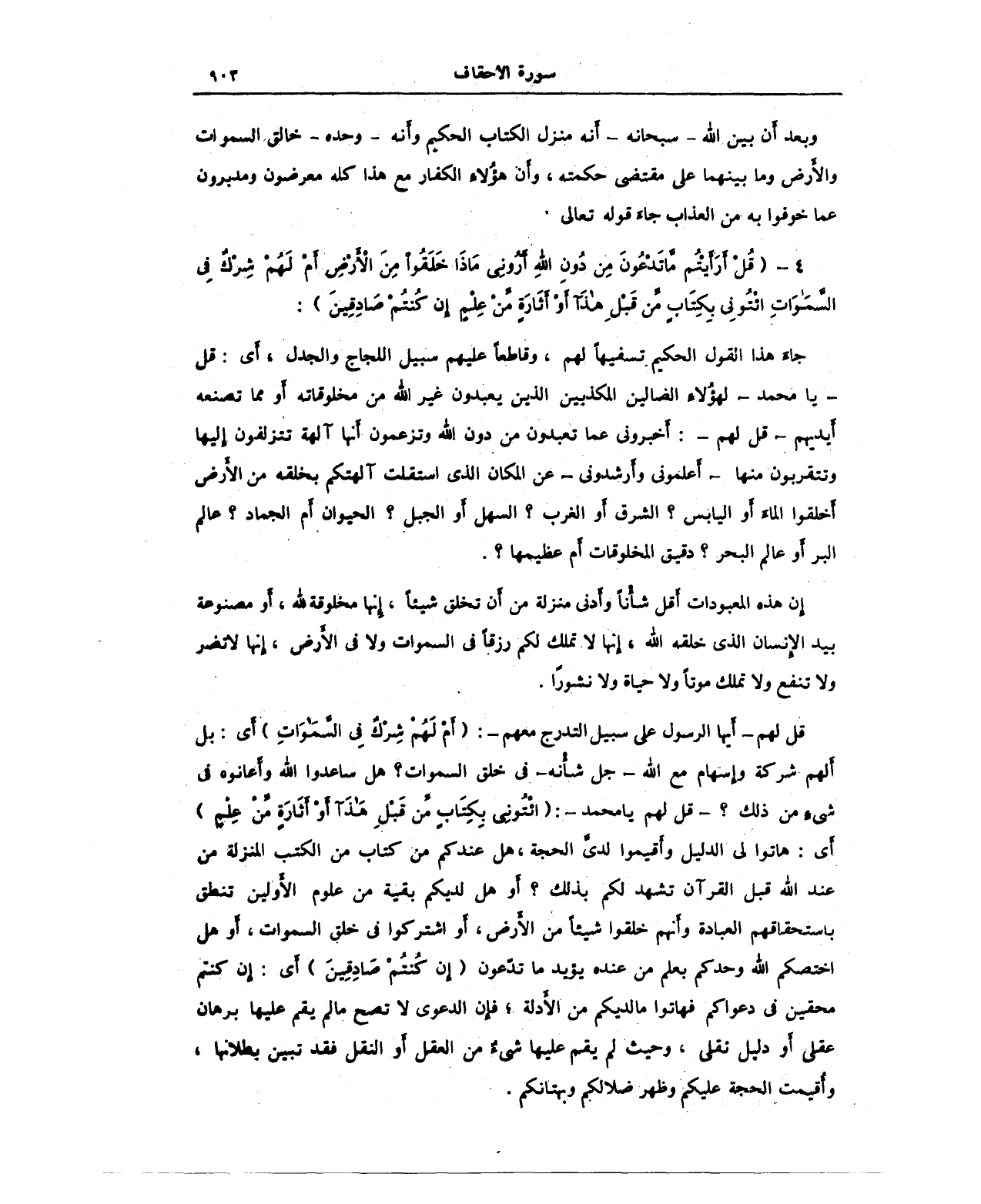 4 - {قُلْ أَرَأَيْتُمْ مَا تَدْعُونَ مِنْ دُونِ اللَّهِ أَرُونِي مَاذَا خَلَقُوا مِنَ الْأَرْضِ أَمْ لَهُمْ شِرْكٌ فِي السَّمَاوَاتِ ائْتُونِي بِكِتَابٍ مِنْ قَبْلِ هَذَا أَوْ أَثَارَةٍ مِنْ عِلْمٍ إِنْ كُنْتُمْ صَادِقِينَ}: