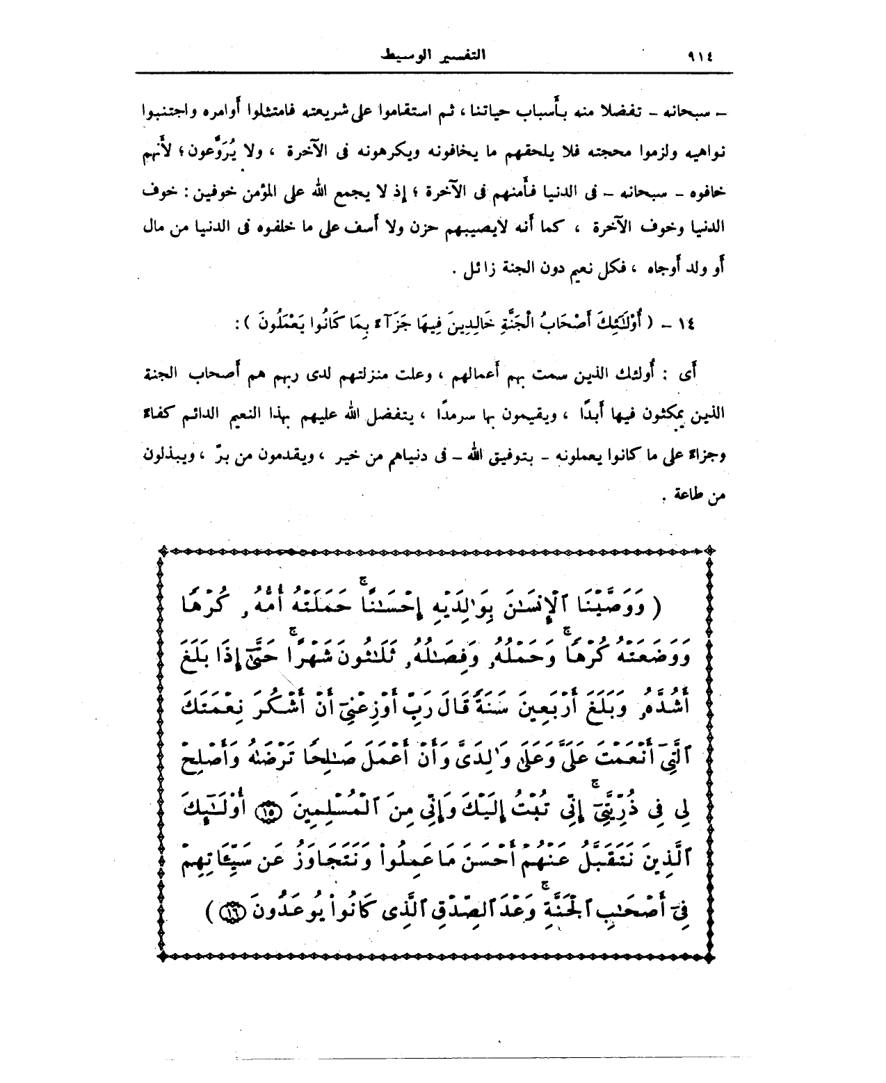 {وَوَصَّيْنَا الْإِنْسَانَ بِوَالِدَيْهِ إِحْسَانًا حَمَلَتْهُ أُمُّهُ كُرْهًا وَوَضَعَتْهُ كُرْهًا وَحَمْلُهُ وَفِصَالُهُ ثَلَاثُونَ شَهْرًا حَتَّى إِذَا بَلَغَ أَشُدَّهُ وَبَلَغَ أَرْبَعِينَ سَنَةً قَالَ رَبِّ أَوْزِعْنِي أَنْ أَشْكُرَ نِعْمَتَكَ الَّتِي أَنْعَمْتَ عَلَيَّ وَعَلَى وَالِدَيَّ وَأَنْ أَعْمَلَ صَالِحًا تَرْضَاهُ وَأَصْلِحْ لِي فِي ذُرِّيَّتِي إِنِّي تُبْتُ إِلَيْكَ وَإِنِّي مِنَ الْمُسْلِمِينَ (15) أُولَئِكَ الَّذِينَ نَتَقَبَّلُ عَنْهُمْ أَحْسَنَ مَا عَمِلُوا وَنَتَجَاوَزُ عَنْ سَيِّئَاتِهِمْ فِي أَصْحَابِ الْجَنَّةِ وَعْدَ الصِّدْقِ الَّذِي كَانُوا يُوعَدُونَ}