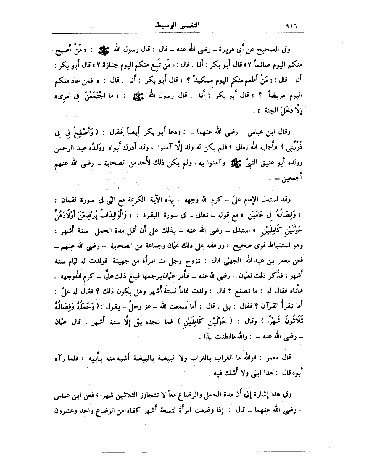 وقد استدل الإمام عليّ - كرم الله وجهه - بهذه الآية الكريمة مع التي في سورة لقمان: {وفصاله في عامين} مع قوله - تعالى - في سورة البقرة: {والوالدات يرضعن أولادهن حولين كاملين} استدل - رضي الله عنه - بذلك على أن أقل مدة الحمل ستة أشهر، وهو استنباط قوى صحيح. ووافقه على ذلك عثمان وجماعة من الصحابة - رضي الله عنهم - فعن معمر بن عبد الله الجهني قال: تزوج رجل منا امرأة من جهينة فولدت له لتمام ستة أشهر، فذُكر ذلك لعثمان - رضي الله عنه - فأمر عثمان برجمها فبلغ ذلك عليًّا - كرم الله وجهه - فأتاه فقال له: ما تصنع؟ قال: ولدت تمامًا لستة أشهر وهل يكون ذلك؟ فقال له عليّ: أما تقرأ القرآن؟ فقال: بلى. قال: أما سمعت الله - عَزَّ وَجَلَّ - يقول: {وحمله وفصاله ثلاثون شهرا} وقال: {حولين كاملين} فما نجده بقي إلاَّ سته أشهر. قال عثمان - رضي الله عنه -: والله ما فطنت بهذا.