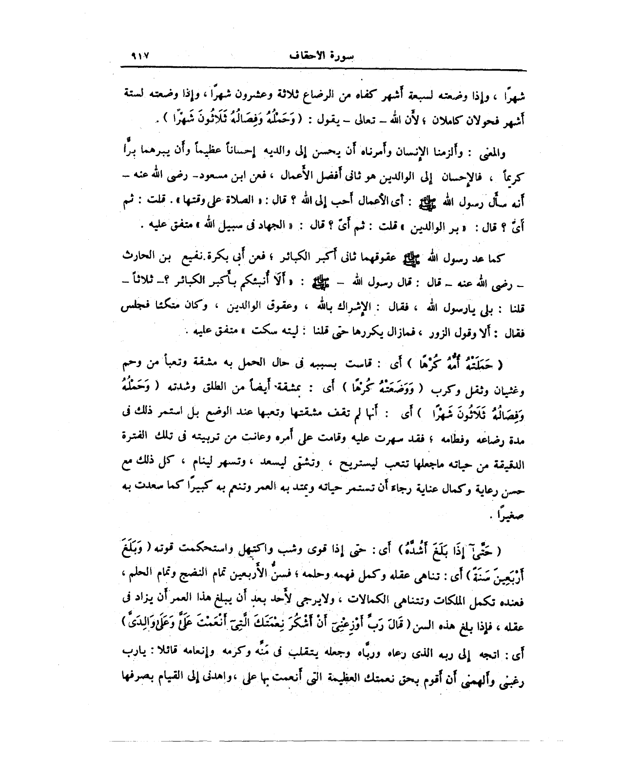 {حملته أمه كرها} أي: قاست بسببه في حال الحمل به مشقة وتعبًا من رحم وغثيان وثقل وكرب {ووضعته كرهًا} أي: بمشقة أيضًا من الطلق وشدته {وحمله وفصاله ثلاثون شهرًا} أي: أنهما لم تقف مشقتها وتعبها عند الوضع بل استمر ذلك في مدة رضاعه وفطامه؛ فقد سهرت عليه وقامت على أمره وعانت من تربيته في تلك الفترة الدقيقة من حياته ما جعلها تتعب ليستريح، وتشقى ليسعد، وتسهر لينام، كل ذلك مع حسن رعاية وكمال عناية رجاء أن تستمر حياته ويمتد به العمر وتنعم به كبيرًا كما سعدت به صغيرًا.