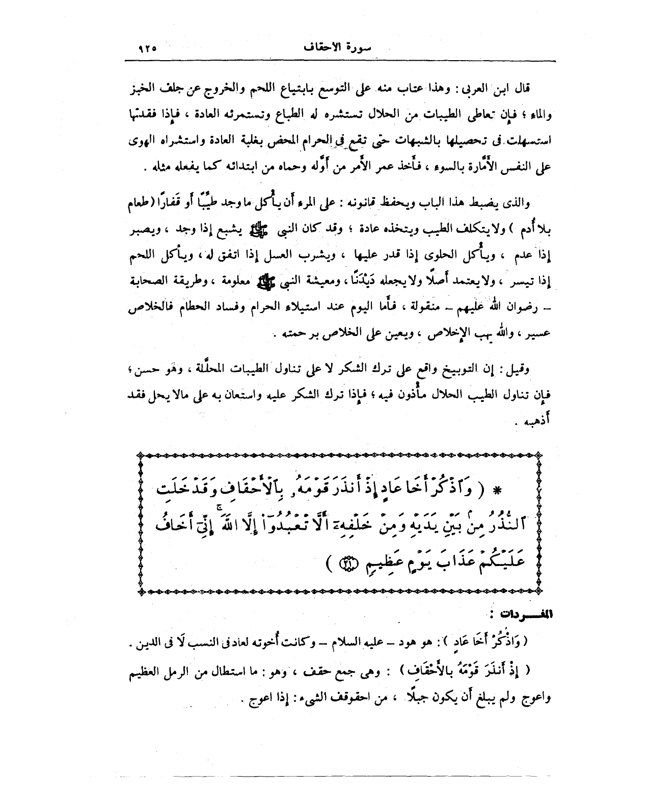 {وَاذْكُرْ أَخَا عَادٍ إِذْ أَنْذَرَ قَوْمَهُ بِالْأَحْقَافِ وَقَدْ خَلَتِ النُّذُرُ مِنْ بَيْنِ يَدَيْهِ وَمِنْ خَلْفِهِ أَلَّا تَعْبُدُوا إِلَّا اللَّهَ إِنِّي أَخَافُ عَلَيْكُمْ عَذَابَ يَوْمٍ عَظِيمٍ}