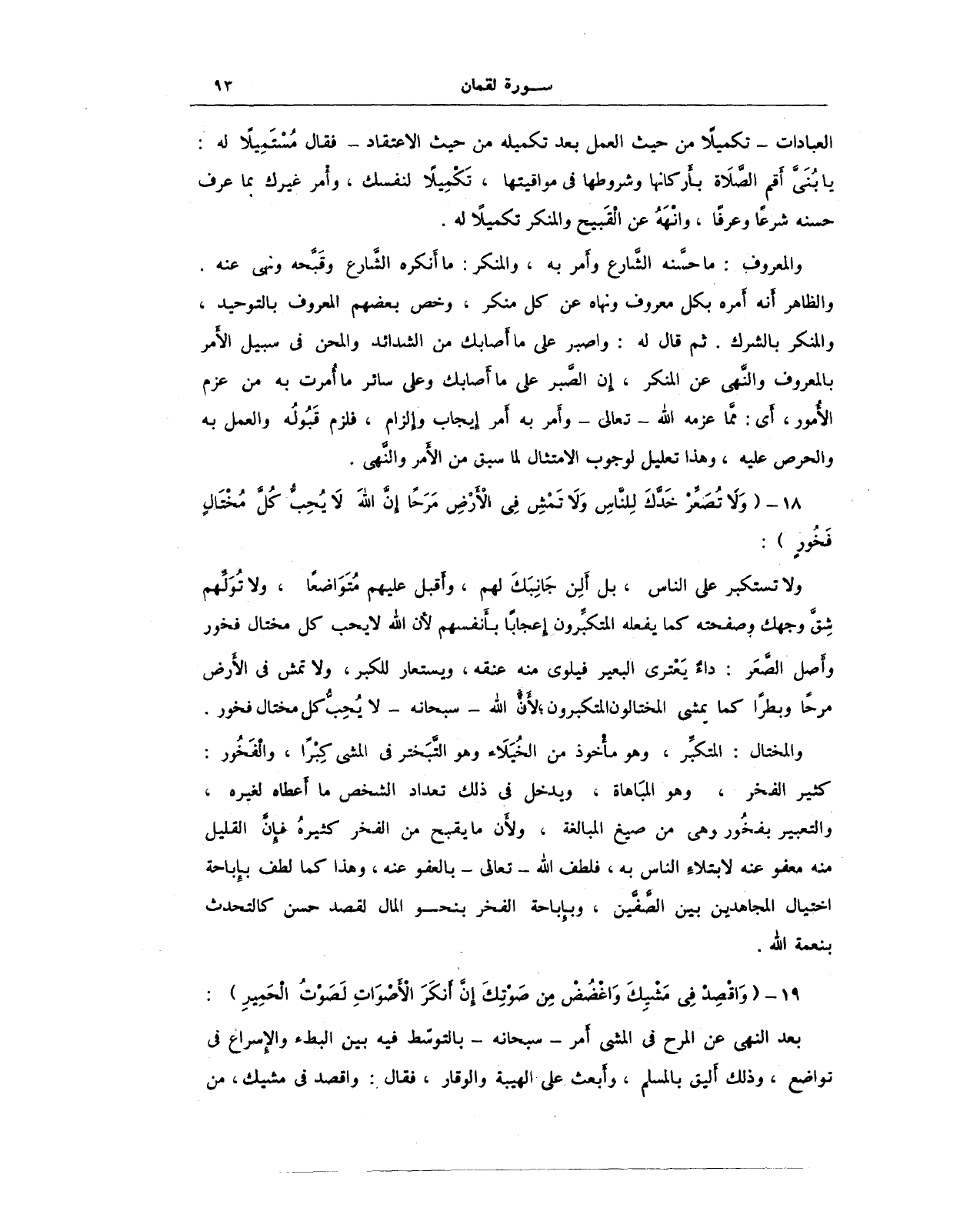 ولا تستكبر على الناس، بل ألِن جانبك لهم، وأقبل عليهم متواضعًا، ولا تُوَلِّهم شِقَّ وجهك وصفحته كما يفعله المتكبِّرون إعجابًا بأنفسهم لأن الله لا يحب كل مختال فخور وأصل الصَّعَر: داءٌ يَعتري البعير فيلوى منه عنقه، ويستعار للكبر، ولا تمش في الأرض مرحًا وبطرًا كما يمشي المختالون المتكبرون؛ لأن الله - سبحانه - لا يُحبُّ كل مختال فخور. والمختال: المتكبِّر، وهو مأخوذ من الخيلاء وهو التَّبَختر في المشي كِبرًا، والفخور: كثير الفخر، وهو المباهاة، ويدخل في ذلك تعداد الشخص ما أعطاه لغيره، والتعبير بفخور وهي من صيغ المبالغة، ولأن ما يقبح من الفخر كثيرة فإن القليل منه معفو عنه لابتلاء الناس به، فلطف الله - تعالى - بالعفو عنه، وهذا كما لطف بإباحة اختيال المجاهدين بين الصَّفَّين، وبإباحة الفخر بنحو المال لقصد حسن كالتحدث بنعمة الله.