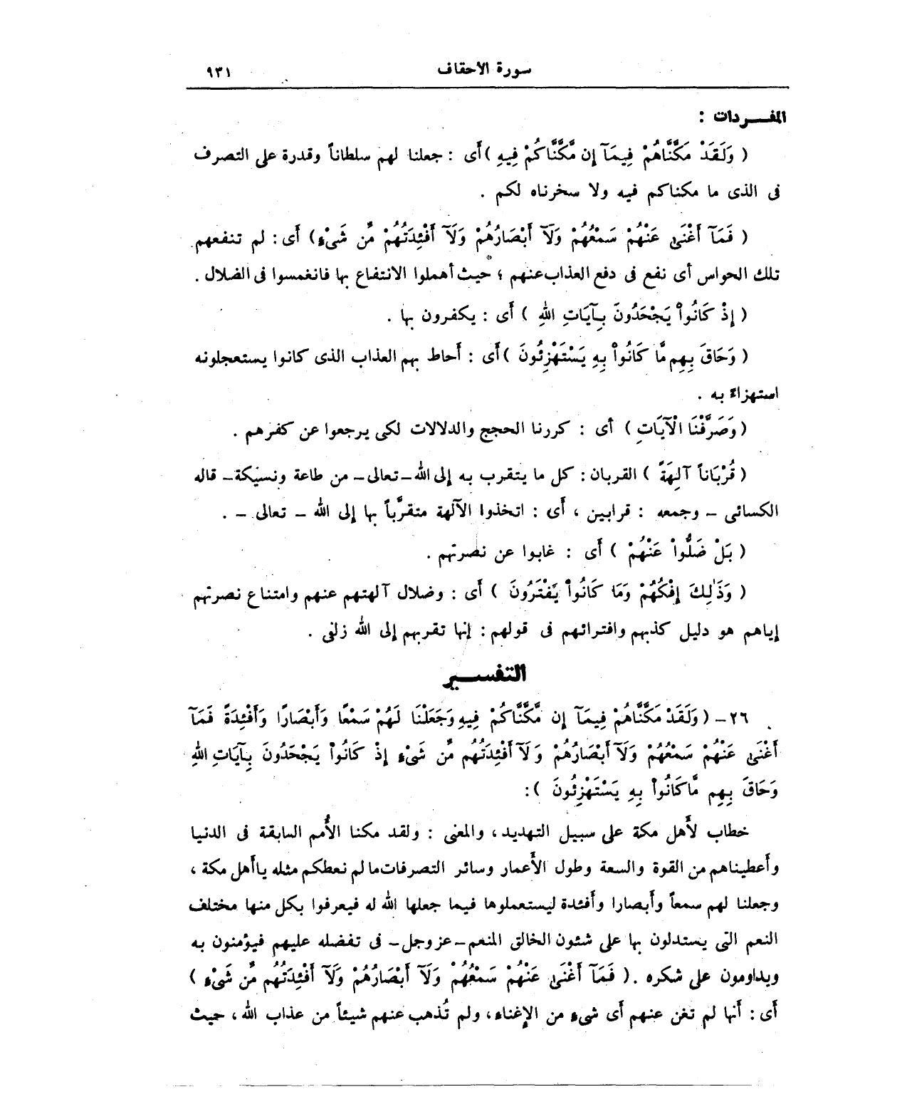 خطاب لأهل مكة على سبيل التهديد، والمعنى: ولقد مكنا الأمم السابقة في الدنيا وأعطيناهم من القوة والسعة وطول الأعمار وسائر التصرفات ما لم نعطكم مثله يا أهل مكة، وجعلنا لهم سمعًا وأبصارا وأفئدة ليستعملوها فيما جعلها الله له فيعرفوا بكل منها مختلف النعم التي يستدلون بها على شئون الخالق المنعم - عَزَّ وَجَلَّ - في تفضله عليهم فيؤمنون به ويداومون على شكره. {فَمَا أَغْنَى عَنْهُمْ سَمْعُهُمْ وَلَا أَبْصَارُهُمْ وَلَا أَفْئِدَتُهُمْ مِنْ شَيْءٍ} أي: أنها لم تغن عنهم أي شيء من الإغناء، ولم تُذهب عنهم شيئًا من عذاب الله،