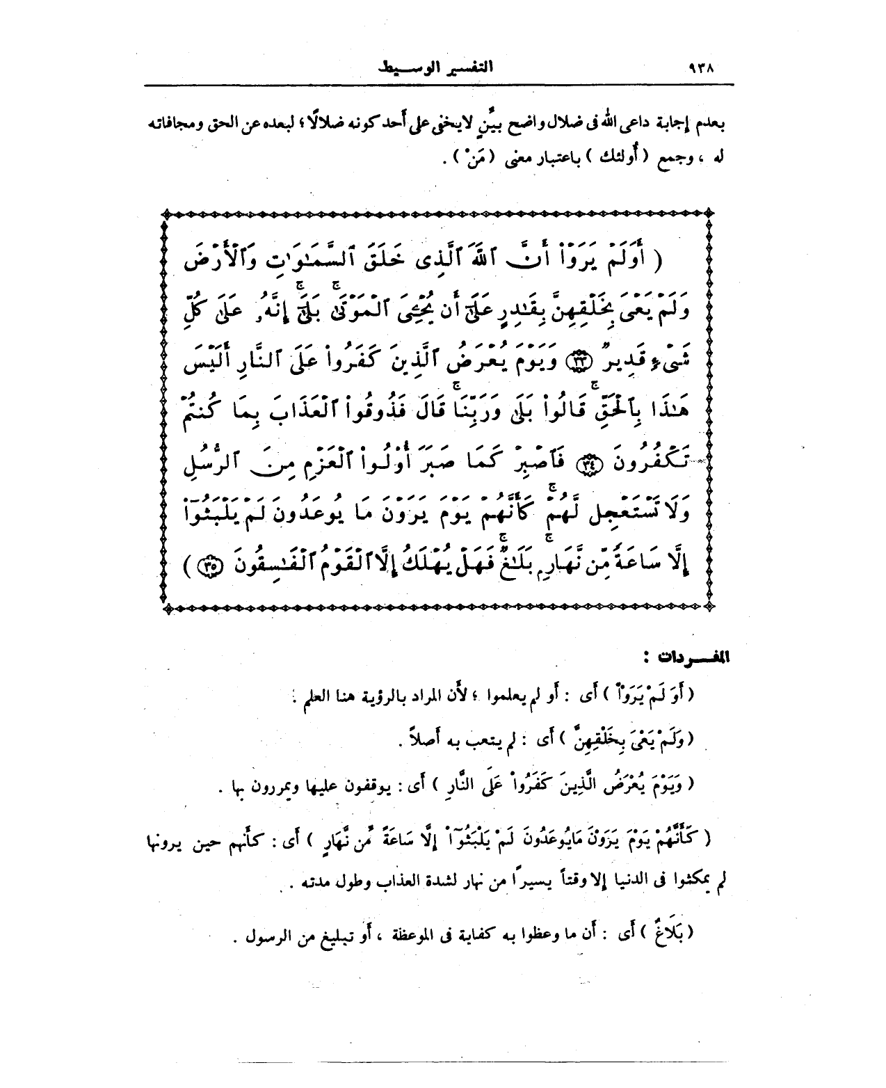 {أَوَلَمْ يَرَوْا أَنَّ اللَّهَ الَّذِي خَلَقَ السَّمَاوَاتِ وَالْأَرْضَ وَلَمْ يَعْيَ بِخَلْقِهِنَّ بِقَادِرٍ عَلَى أَنْ يُحْيِيَ الْمَوْتَى بَلَى إِنَّهُ عَلَى كُلِّ شَيْءٍ قَدِيرٌ (33) وَيَوْمَ يُعْرَضُ الَّذِينَ كَفَرُوا عَلَى النَّارِ أَلَيْسَ هَذَا بِالْحَقِّ قَالُوا بَلَى وَرَبِّنَا قَالَ فَذُوقُوا الْعَذَابَ بِمَا كُنْتُمْ تَكْفُرُونَ (34) فَاصْبِرْ كَمَا صَبَرَ أُولُوالْعَزْمِ مِنَ الرُّسُلِ وَلَا تَسْتَعْجِلْ لَهُمْ كَأَنَّهُمْ يَوْمَ يَرَوْنَ مَا يُوعَدُونَ لَمْ يَلْبَثُوا إِلَّا سَاعَةً مِنْ نَهَارٍ بَلَاغٌ فَهَلْ يُهْلَكُ إِلَّا الْقَوْمُ الْفَاسِقُونَ}