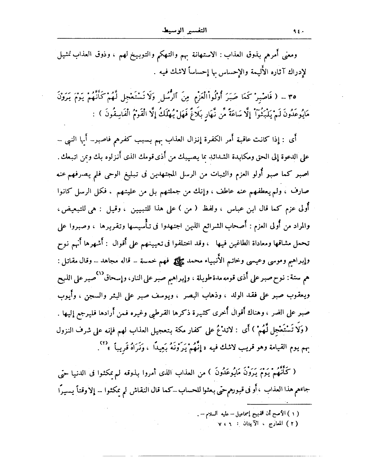 أي: إذا كانت عاقبة أمر الكفرة إنزال العذاب بهم بسبب كفرهم فاصبر - أيها النبي - على الدعوة إلى الحق ومكابدة الشدائد بما يصيبك من أذى قومك الذي أنزلوه بك وبمن اتبعك. اصبر كما صبر أُولو العزم والثبات من الرسل المجتهدين في تبليغ الوحي فلم يصرفهم عنه صارف، ولم يعطفهم عنه عاطف، وإنك من جملتهم بل من عليتهم. فكل الرسل كانوا أُولى عزم كما قال ابن عباس، ولفظ (من) على هذا للتبيين، وقيل: هي لا تبعيض، والمراد من أُولي العزم: أصحاب الشرائع الذين اجتهدوا في تأسيسها وتقريرها، وصبروا على تحمل مشاقها ومعاداة الطاغين فيها، وقد اختلفوا في تعيينهم على أقوال: أشهرها أنهم نوح وإبراهيم وموسى وعيسى وخاتم الأنبياء محمَّد - صلى الله عليه وسلم - فهم خمسة - قاله مجاهد - وقال مقاتل: هم ستة: نوح صبر على أذى قومه مدة طويلة، وإبراهيم صبر على النار، وإسحاق (¬1) صبر على الذبح ويعقوب صبر على فقد الولد، وذهاب البصر، ويوسف صبر على البئر والسجن، وأيوب صبر على الضر، وهناك أقوال أخرى كثرة ذكرها القرطبي وغيره فمن أرادها فليرجع إليها.