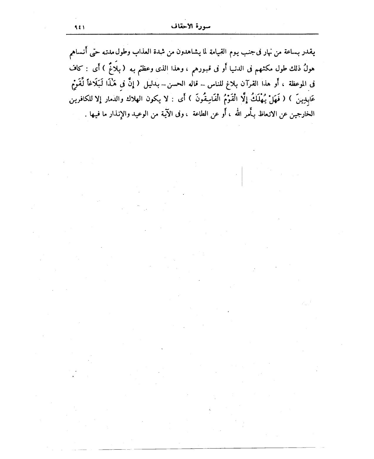 يقدر بساعة من نهار في جنب يوم القيامة لما يشاهدون من شدة العذاب وطول مدته حتى أنساهم هولُ ذلك طول مكثهم في الدنيا أو في قبورهم، وهذا الذي وعظتم به {بلاغٌ} أي: كاف في الموعظة، أو هذا القرآن بلاغ للناس - قال الحسن - بدليل {إن في هذا لبلاغًا لقوم عابدين} {فَهَلْ يُهْلَكُ إِلَّا الْقَوْمُ الْفَاسِقُونَ} أي: لا يكون الهلاك والدمار إلا للكافرين الخارجين عن الاتعاظ بأمر الله، أو عن الطاعة، وفي الآية من الوعيد والإنذار ما فيها.