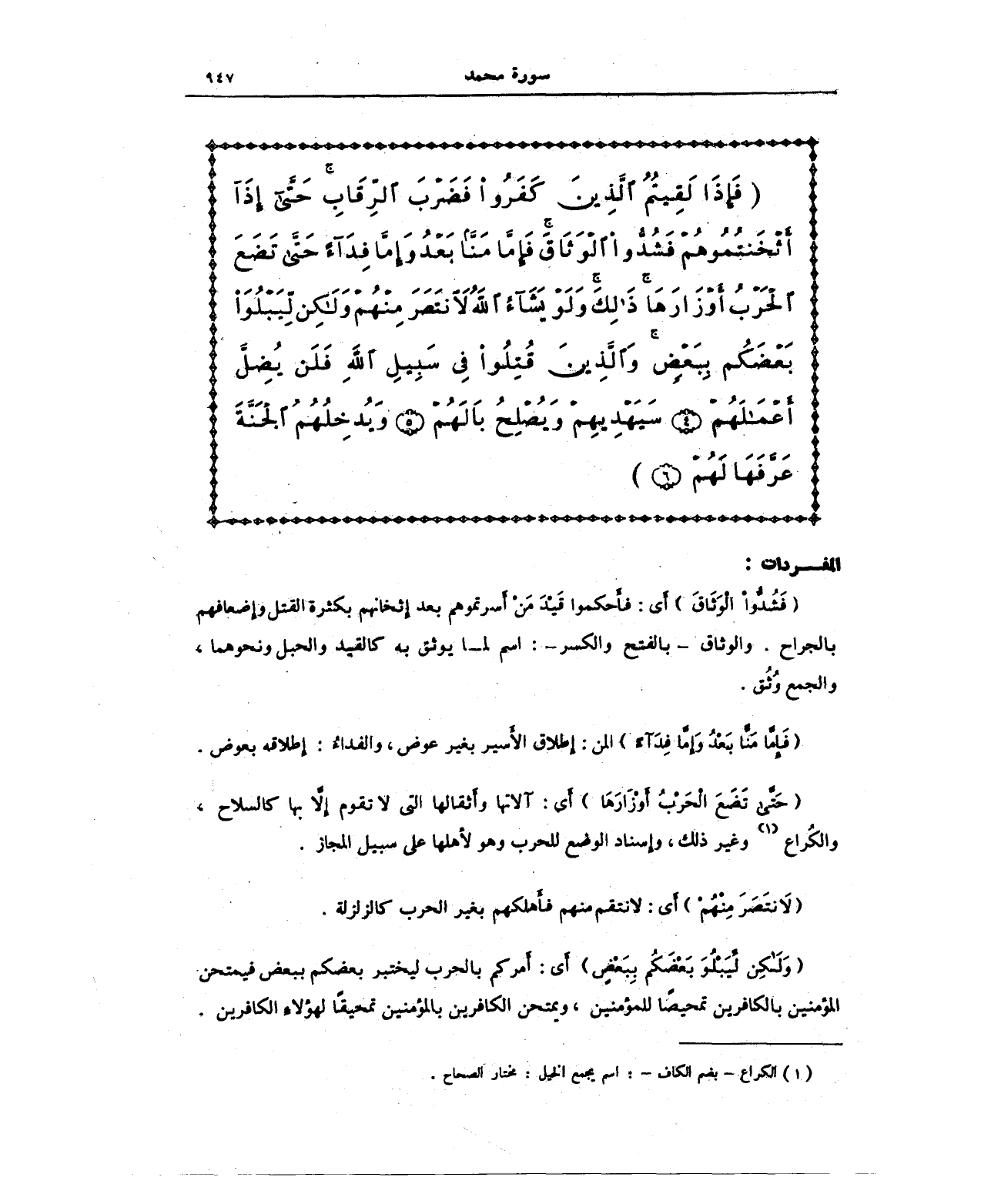 {فَإِذَا لَقِيتُمُ الَّذِينَ كَفَرُوا فَضَرْبَ الرِّقَابِ حَتَّى إِذَا أَثْخَنْتُمُوهُمْ فَشُدُّوا الْوَثَاقَ فَإِمَّا مَنًّا بَعْدُ وَإِمَّا فِدَاءً حَتَّى تَضَعَ الْحَرْبُ أَوْزَارَهَا ذَلِكَ وَلَوْ يَشَاءُ اللَّهُ لَانْتَصَرَ مِنْهُمْ وَلَكِنْ لِيَبْلُوَ بَعْضَكُمْ بِبَعْضٍ وَالَّذِينَ قُتِلُوا فِي سَبِيلِ اللَّهِ فَلَنْ يُضِلَّ أَعْمَالَهُمْ (4) سَيَهْدِيهِمْ وَيُصْلِحُ بَالَهُمْ (5) وَيُدْخِلُهُمُ الْجَنَّةَ عَرَّفَهَا لَهُمْ (6)}