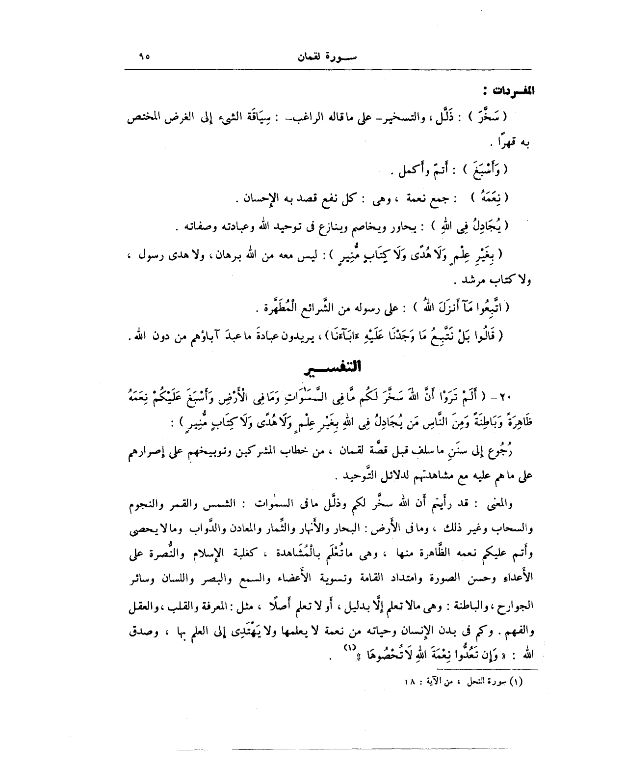 والمعنى: قد رأيتم أن الله سخر لكم وذلَّل ما في السموات: الشمس والقمر والنجوم والسحاب وغير ذلك، وما في الأرض: البحار والأنهار والثِّمار والمعادن والدَّواب وما لا يحصى وأتم عليكم نعمه الظاهرة منها، وهي ما تُعْلَم بالمشاهدة، كغلبة الإِسلام والنُّصرة على الأعداء وحسن الصورة وامتداد القامة وتسوية الأعضاء والسمع والبصر واللسان وسائر الجوارح، والباطنة: وهي ما لا تعلم إلاَّ بدليل، أو لا تعلم أصلًا، مثل: المعرفة والقلب، والعقل والفهم. وكم في بدن الإنسان وحياته من نعمة لا يعلمها ولا يَهتدي إلى العلم بها، وصدق الله: {وَإِنْ تَعُدُّوا نِعْمَةَ اللَّهِ لَا تُحْصُوهَا} (¬1).