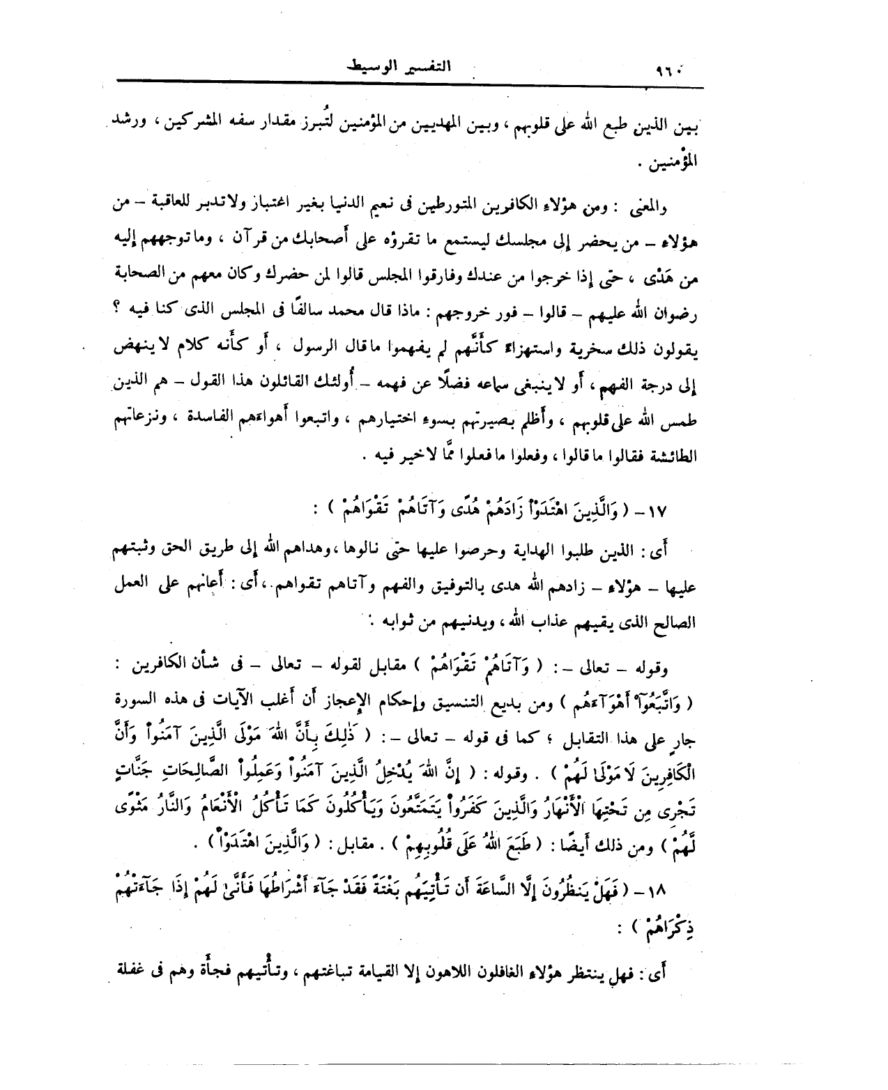 والمعنى: ومن هؤلاء الكافرين المتورطين في نعيم الدنيا بغير اعتبار ولا تدبر للعاقبة - من هؤلاء - من يحضر إلى مجلسك ليستمع ما تقرؤه على أصحابك من قرآن، وما توجههم إليه من هَدْى، حتى إذا خرجوا من عندك وفارقوا المجلس قالوا لمن حضرك وكان معهم من الصحابة رضوان الله عليهم - قالوا - فور خروجهم: ماذا قال محمَّد سالفا في المجلس الذي كنا فيه؟ يقولون ذلك سخرية واستهزاء كأنَّهم لم يفهموا ما قال الرسول، أو كأنه كلام لا ينهض إلى درجة الفهم، أو لا ينبغي سماعه فضلًا عن فهمه - أولئك القائلون هذا القول - هم الذين طمس الله على قلوبهم، وأظلم بصيرتهم بسوء اختيارهم، واتبعوا أهواءهم الفاسدة، ونزعاتهم الطائشة فقالوا ما قالوا، وفعلوا ما فعلوا مما لا خير فيه.