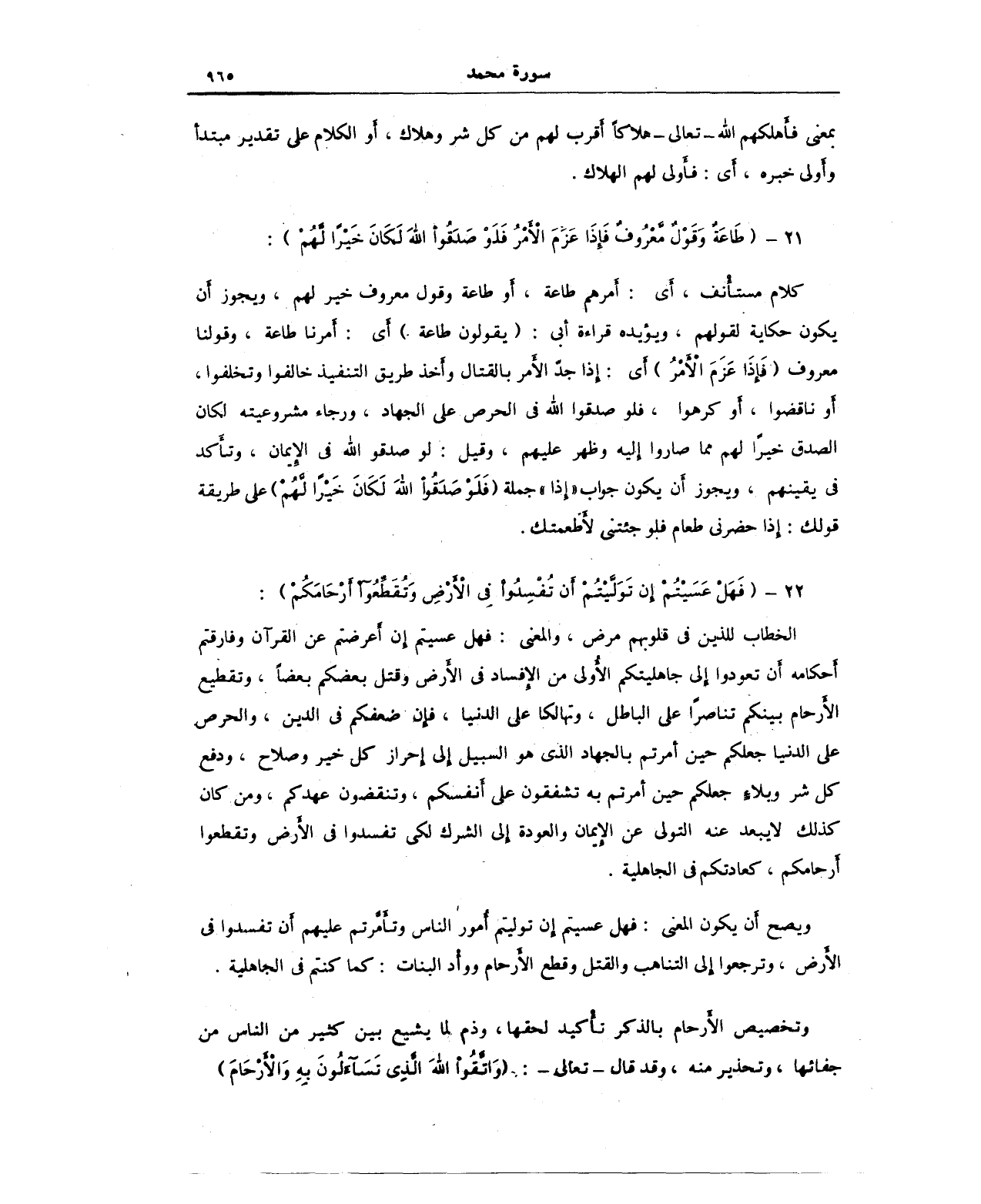 الخطاب للذين في قلوبهم مرض، والمعنى: فهل عسيتم إن أعرضتم عن القرآن وفارقتم أحكامه أن تعودوا إلى جاهليتكم الأولى من الإفساد في الأرض وقتل بعضكم بعضًا، وتقطيع الأرحام بينكم تناصرًا على الباطل، وتهالكا على الدنيا، فإنه ضعفكم في الدين، والحرص على الدنيا جعلكم حين أمرتم بالجهاد الذي هو السبيل إلى إحراز كل خير وصلاح، ودفع كل شر وبلاءٍ جعلكم حين أمرتم به تشفقون على أنفسكم، وتنقضون عهدكم، ومن كان كذلك لا يبعد عنه التولى عن الإيمان والعودة إلى الشرك لكي تفسدوا في الأرض وتقطعوا أرحامكم، كعادتكم في الجاهلية.