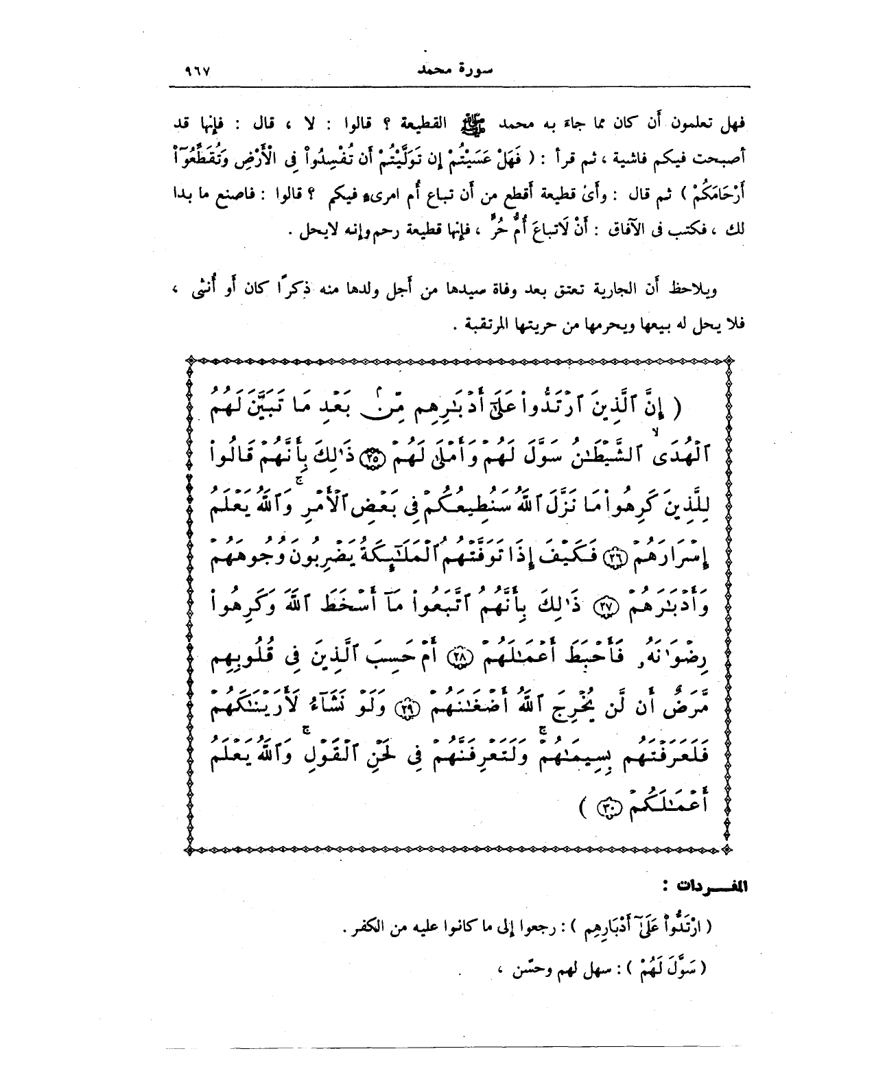{إِنَّ الَّذِينَ ارْتَدُّوا عَلَى أَدْبَارِهِمْ مِنْ بَعْدِ مَا تَبَيَّنَ لَهُمُ الْهُدَى الشَّيْطَانُ سَوَّلَ لَهُمْ وَأَمْلَى لَهُمْ (25) ذَلِكَ بِأَنَّهُمْ قَالُوا لِلَّذِينَ كَرِهُوا مَا نَزَّلَ اللَّهُ سَنُطِيعُكُمْ فِي بَعْضِ الْأَمْرِ وَاللَّهُ يَعْلَمُ إِسْرَارَهُمْ (26) فَكَيْفَ إِذَا تَوَفَّتْهُمُ الْمَلَائِكَةُ يَضْرِبُونَ وُجُوهَهُمْ وَأَدْبَارَهُمْ (27) ذَلِكَ بِأَنَّهُمُ اتَّبَعُوا مَا أَسْخَطَ اللَّهَ وَكَرِهُوا رِضْوَانَهُ فَأَحْبَطَ أَعْمَالَهُمْ (28) أَمْ حَسِبَ الَّذِينَ فِي قُلُوبِهِمْ مَرَضٌ أَنْ لَنْ يُخْرِجَ اللَّهُ أَضْغَانَهُمْ (29) وَلَوْ نَشَاءُ لَأَرَيْنَاكَهُمْ فَلَعَرَفْتَهُمْ بِسِيمَاهُمْ وَلَتَعْرِفَنَّهُمْ فِي لَحْنِ الْقَوْلِ وَاللَّهُ يَعْلَمُ أَعْمَالَكُمْ (30)}