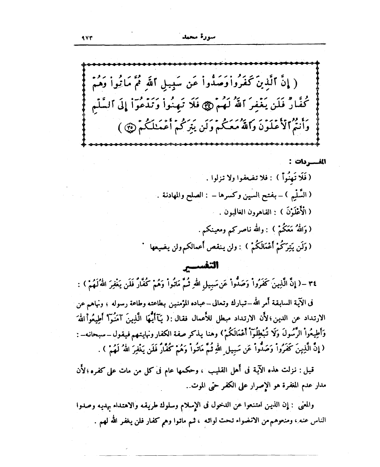 {إِنَّ الَّذِينَ كَفَرُوا وَصَدُّوا عَنْ سَبِيلِ اللَّهِ ثُمَّ مَاتُوا وَهُمْ كُفَّارٌ فَلَنْ يَغْفِرَ اللَّهُ لَهُمْ (34) فَلَا تَهِنُوا وَتَدْعُوا إِلَى السَّلْمِ وَأَنْتُمُ الْأَعْلَوْنَ وَاللَّهُ مَعَكُمْ وَلَنْ يَتِرَكُمْ أَعْمَالَكُمْ (35)}