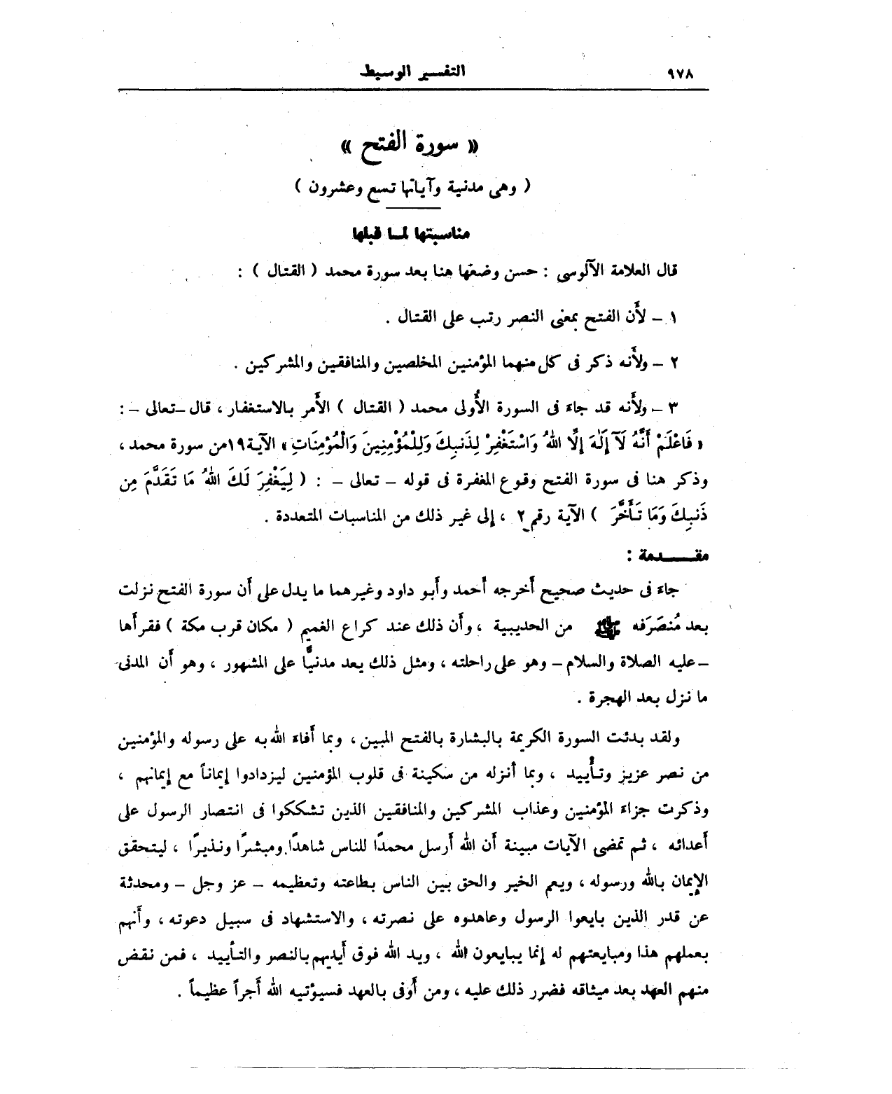 ولقد بدئت السورة الكريمة بالبشارة بالفتح المبين، وبما أفاء الله به على رسوله والمؤمنين من نصر عزيز وتأييد، وبما أنزله من سكينة في قلوب المؤمنين ليزدادوا إيمانًا مع إيمانهم، وذكرت جزاء المؤمنين وعذاب المشركين والمنافقين الذين تشككوا في انتصار الرسول على أعدائه، ثم تمضى الآيات مبينة أن الله أرسل محمدا للناس شاهدًا ومبشرًا ونذيرًا، ليتحقق الإيمان بالله ورسوله، ويعم الخير والحق بين الناس بطاعته وتعظيمه - عَزَّ وَجَلَّ - ومحدثة عن قدر الذين بايعوا الرسول وعاهدوه على نصرته، والاستشهاد في سبيل دعوته، وأنهم بعملهم هذا ومبايعتهم له إنما يبايعون الله، ويد الله فوق أيديهم بالنصر والتأييد، فمن نقض منهم العهد بعد ميثاقه فضرر ذلك عليه، ومن أوفى بالعهد فسيؤتيه الله أجرًا عظيمًا.