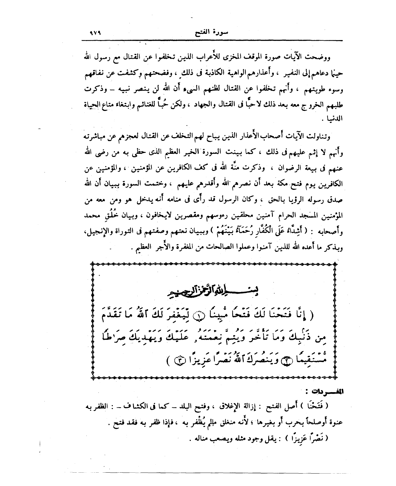 {إِنَّا فَتَحْنَا لَكَ فَتْحًا مُبِينًا (1) لِيَغْفِرَ لَكَ اللَّهُ مَا تَقَدَّمَ مِنْ ذَنْبِكَ وَمَا تَأَخَّرَ وَيُتِمَّ نِعْمَتَهُ عَلَيْكَ وَيَهْدِيَكَ صِرَاطًا مُسْتَقِيمًا (2) وَيَنْصُرَكَ اللَّهُ نَصْرًا عَزِيزًا (3)}
