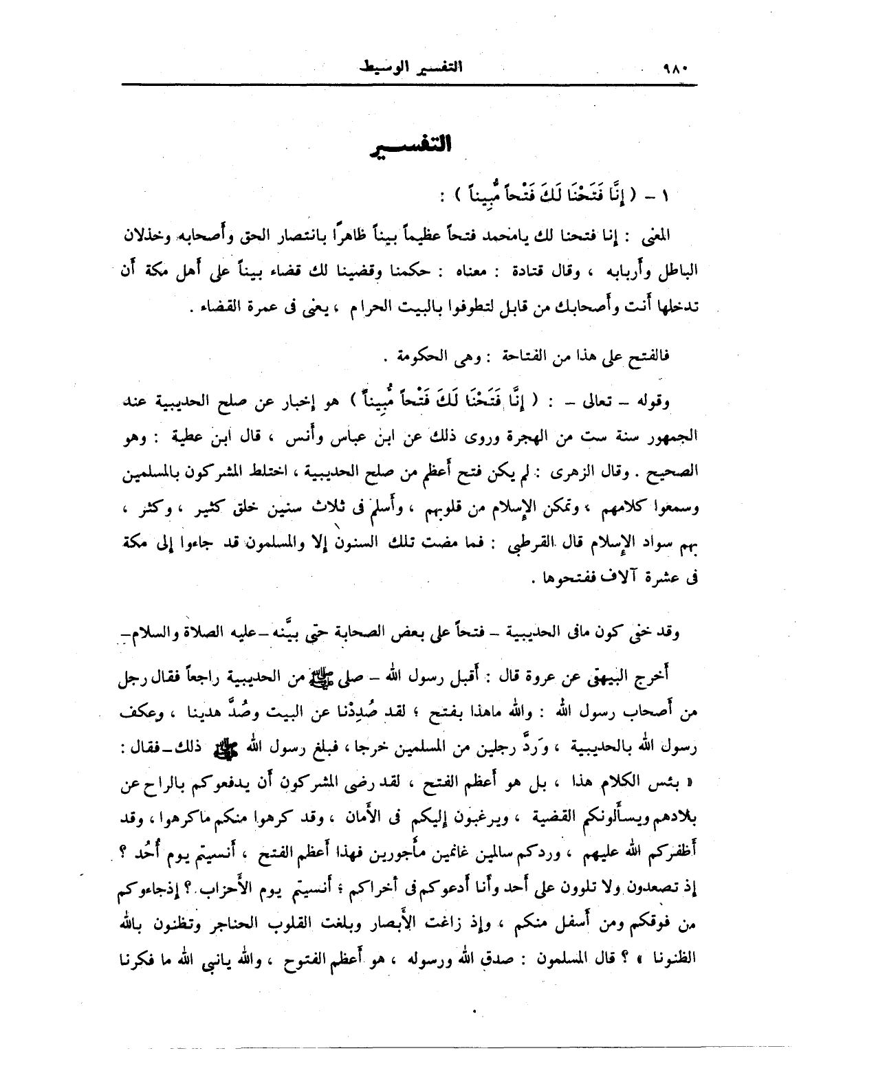 وقوله - تعالى -: {إِنَّا فَتَحْنَا لَكَ فَتْحًا مُبِينًا} هو إخبار عن صلح الحديبية عند الجمهور سنة ست من الهجرة وروى ذلك عن ابن عباس وأنس، قال ابن عطية: وهو الصحيح. وقال الزهرى: لم يكن فتح أعظم من صلح الحديبية، اختلط المشركون بالمسلمين وسمعوا كلامهم، وتمكن الإِسلام من قلوبهم، وأسلم في ثلاث سنين خلق كثير، وكثر، بهم سواد الإِسلام قال القرطبي: فما مضت تلك السنون إلا والمسلمون قد جاءوا إلى مكة في عشرة آلاف ففتحوها.