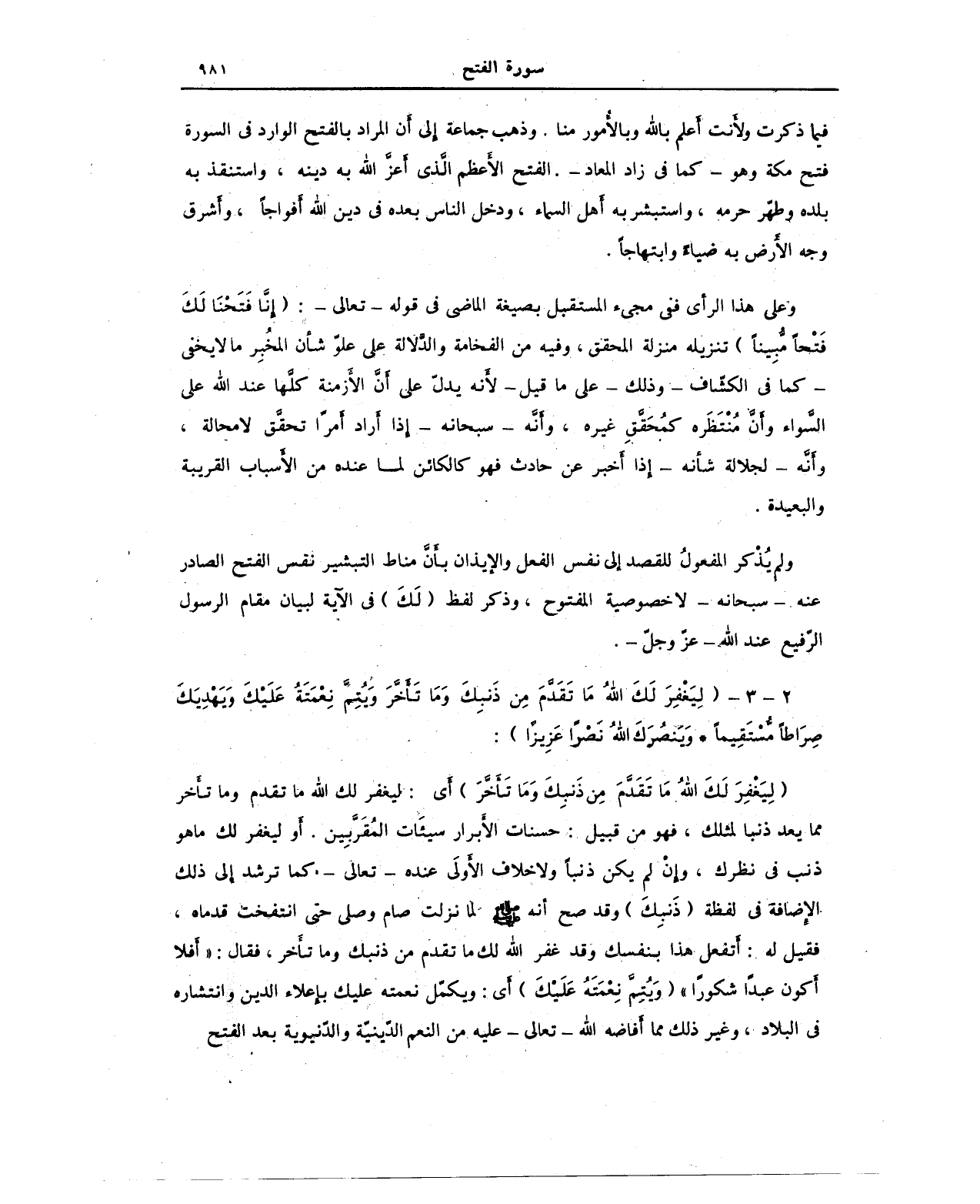 {لِيَغْفِرَ لَكَ اللَّهُ مَا تَقَدَّمَ مِنْ ذَنْبِكَ وَمَا تَأَخَّرَ} أي: ليغفر لك الله ما تقدم وما تأخر مما يعد ذنبا لمثلك، فهو من قبيل: حسنات الأبرار سيئات المقربين. أو ليغفر لك ما هو ذنب في نظرك، وإن لم يكن ذنبا ولا خلاف الأولى عنده - تعالى - كما ترشد إلى ذلك الإضافة في لفظة (ذنبك) وقد صح أنه - صلى الله عليه وسلم - لما نزلت صام وصلى حتى انتفخت قدماه، فقيل له: أتفعل هذا بنفسك وقد غفر الله لك ما تقدم من ذنبك وما تأخر، فقال: "أفلا أكون عبدًا شكورا" {وَيُتِمَّ نِعْمَتَهُ عَلَيْكَ} أي: ويكمّل نعمته عليك بإعلاء الدين وانتشاره في البلاد، وغير ذلك مما أفاضه الله - تعالى - عليه من النعم الدينية والدنيوية بعد الفتح.