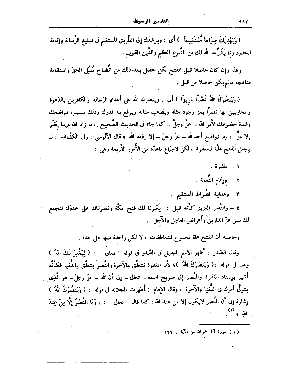 {وَيَنْصُرَكَ اللَّهُ نَصْرًا عَزِيزًا} أي: وينصرك الله على أعداء الرّسالة والكافرين بالدعوة والمحاربين لها نصرا يعز وجود مثله ويصعب مناله ويرفع في قدرك وذلك بسبب تواضعك وشدة خضوعك لأمر الله - عز وجل - كما جاء في الحديث الصحيح: "ما زاد الله عبدا بعفو إلا عزًّا، وما تواضع أحد لله - عز وجل - إلا رفعه الله، قال الآلوسي: وفي الكشاف: لم يجعل الفتح علَّة للمغفرة، لكن لاجتماع ما عدّد من الأمور الأربعة وهي: