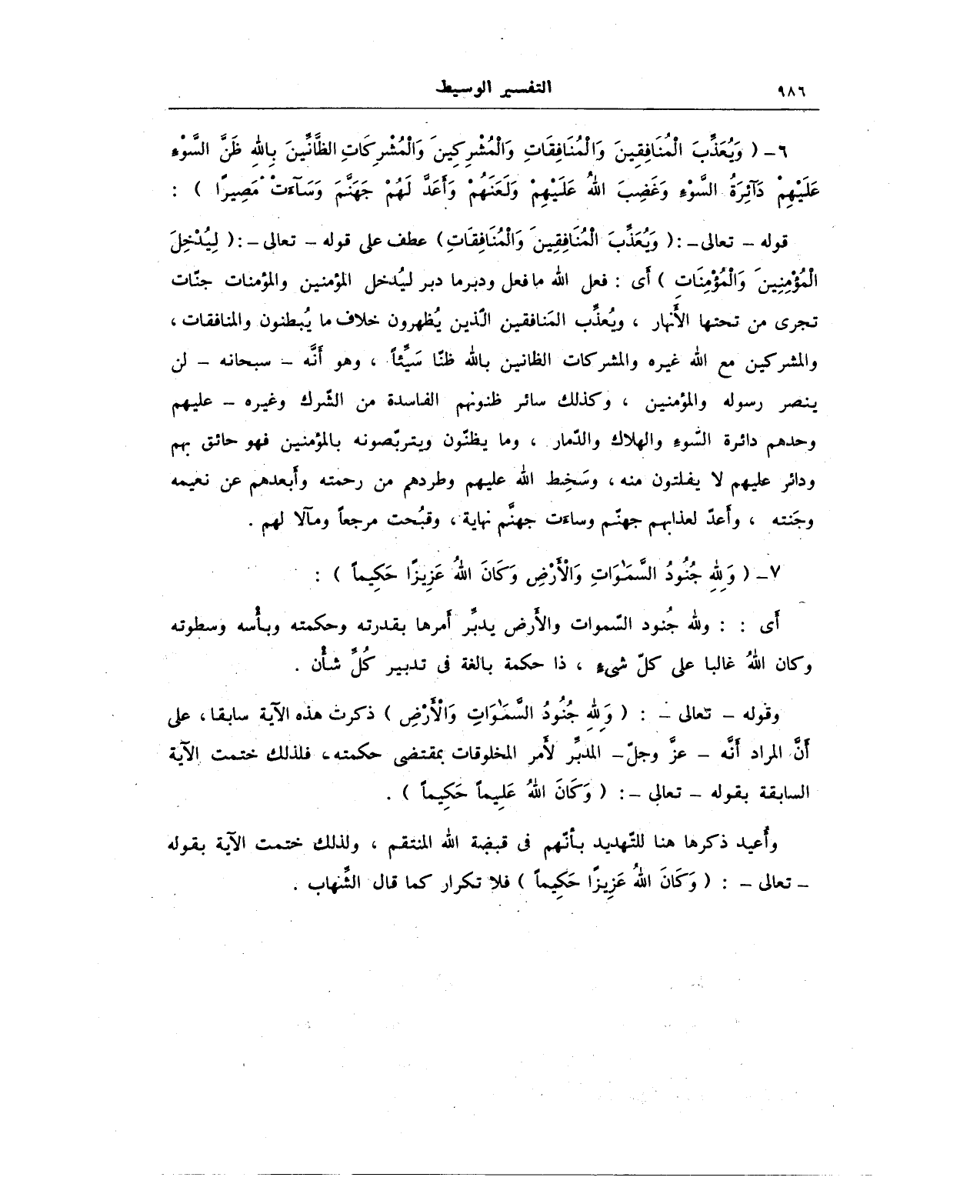 قوله - تعالى -: {وَيُعَذِّبَ الْمُنَافِقِينَ وَالْمُنَافِقَاتِ} عطف على قوله - تعالى -: {لِيُدْخِلَ الْمُؤْمِنِينَ وَالْمُؤْمِنَاتِ} أي: فعل الله ما فعل ودبر ما دبر ليدخل المؤمنين والمؤمنات جنات تجرى من تحتها الأنهار، ويعذب المنافقين الّذين يُظهرون خلاف ما يبطنون والمنافقات، والمشركين مع الله غيره والمشركات الظانين بالله ظنا سيئا، وهو أنَّه - سبحانه - لن ينصر رسوله والمؤمنين، وكذلك سائر ظنونهم الفاسدة من الشرك وغيره - عليهم وحدهم دائرة السوء والهلاك والدّمار، وما يظنون ويتربّصونه بالمؤمنين فهو حائق بهم ودائر عليهم لا يفلتون منه، وسخط الله عليهم وطردهم من رحمته وأبعدهم عن نعيمه وجَنته، وأعدّ لعذابهم جهنم وساءت جهنَّم نهاية، وقبُحت مرجعًا ومآلا لهم.